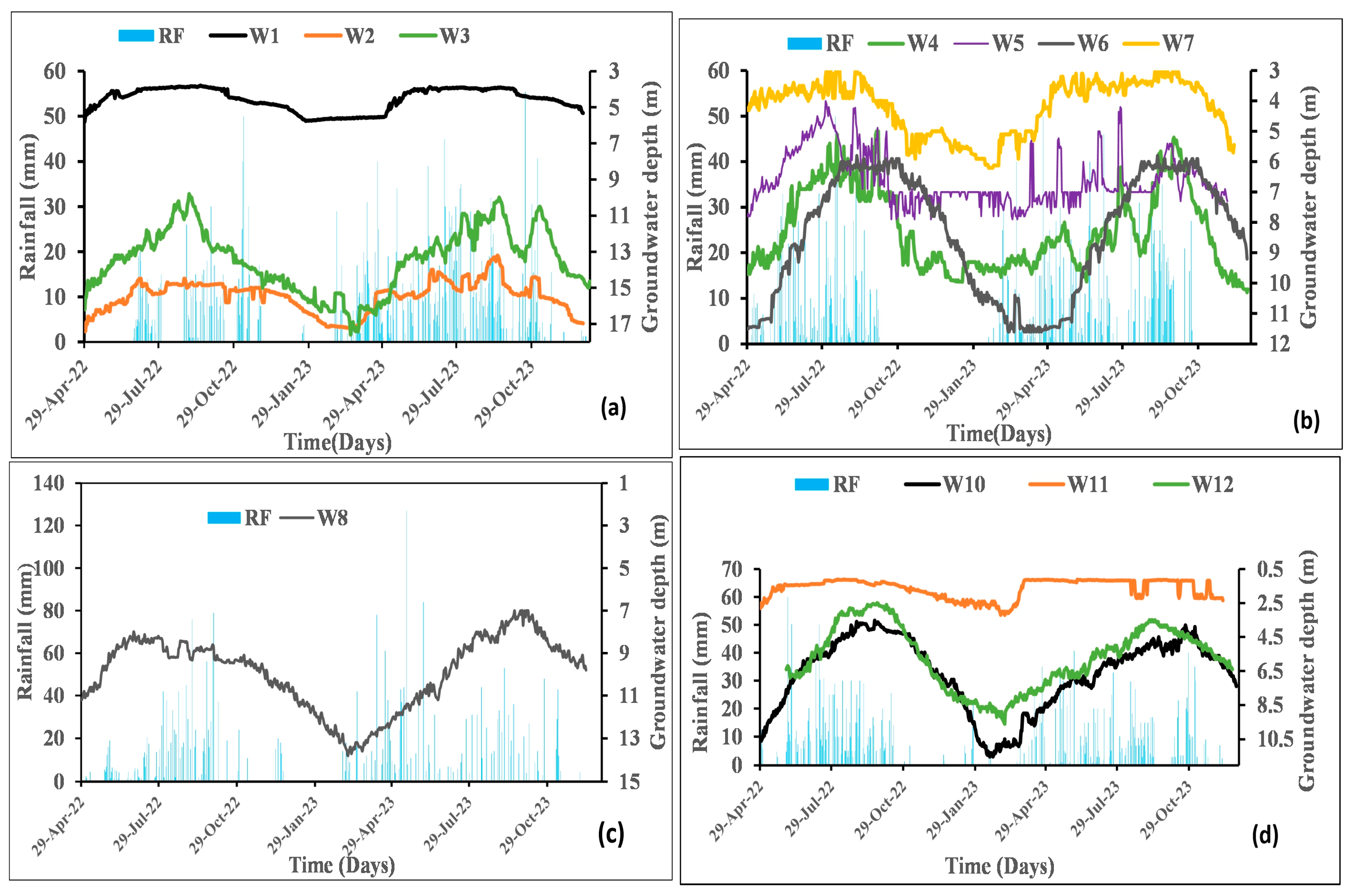 13]. The WTF method provides a localized recharge Estimate specific to the vicinity of the monitoring well. Since water level variations can also reflect lateral groundwater flow, monitoring wells distributed across different parts of a catchment are required to derive a representative, catchment-scale recharge estimate.