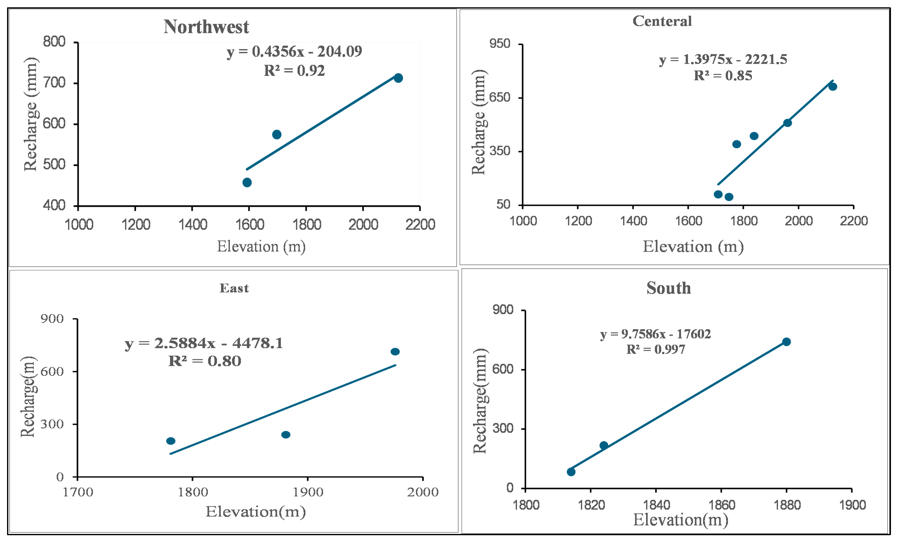 Figure 15 illustrates the relationship between groundwater recharge and elevation in volcanic rock terrains. Most recharge estimates obtained using the WTF method exhibit a linear relationship with the elevation of monitoring points across the northwest, central, southern, and eastern regions.