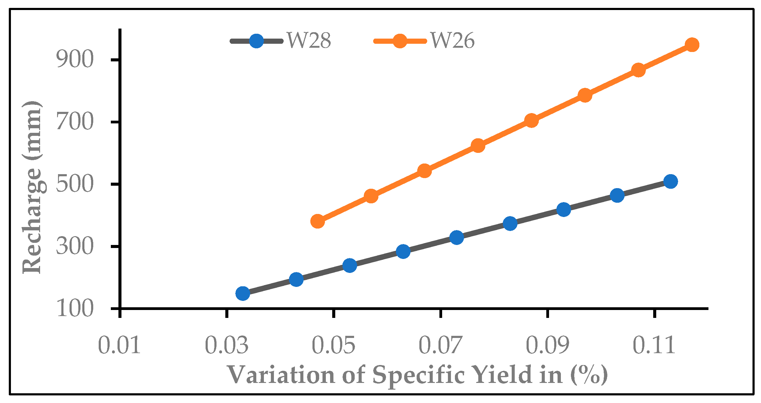 49]. Direct field determination of Sy is preferable when resources permit. Variations in specific yield with depth and associated estimation uncertainties may lead to over or underestimation of recharge using the WTF method. For example, sensitivity analysis was conducted for monitored wells W28, and W26, which are located in distinct aquifer materials, to evaluate the influence of Sy uncertainty on recharge estimation. The results indicate that for every 1% variation in Sy, the estimated recharge changes by ap-proximately 45 mm for W28 and 81 mm for W26, highlighting the strong dependence of WTF results on this parameter (