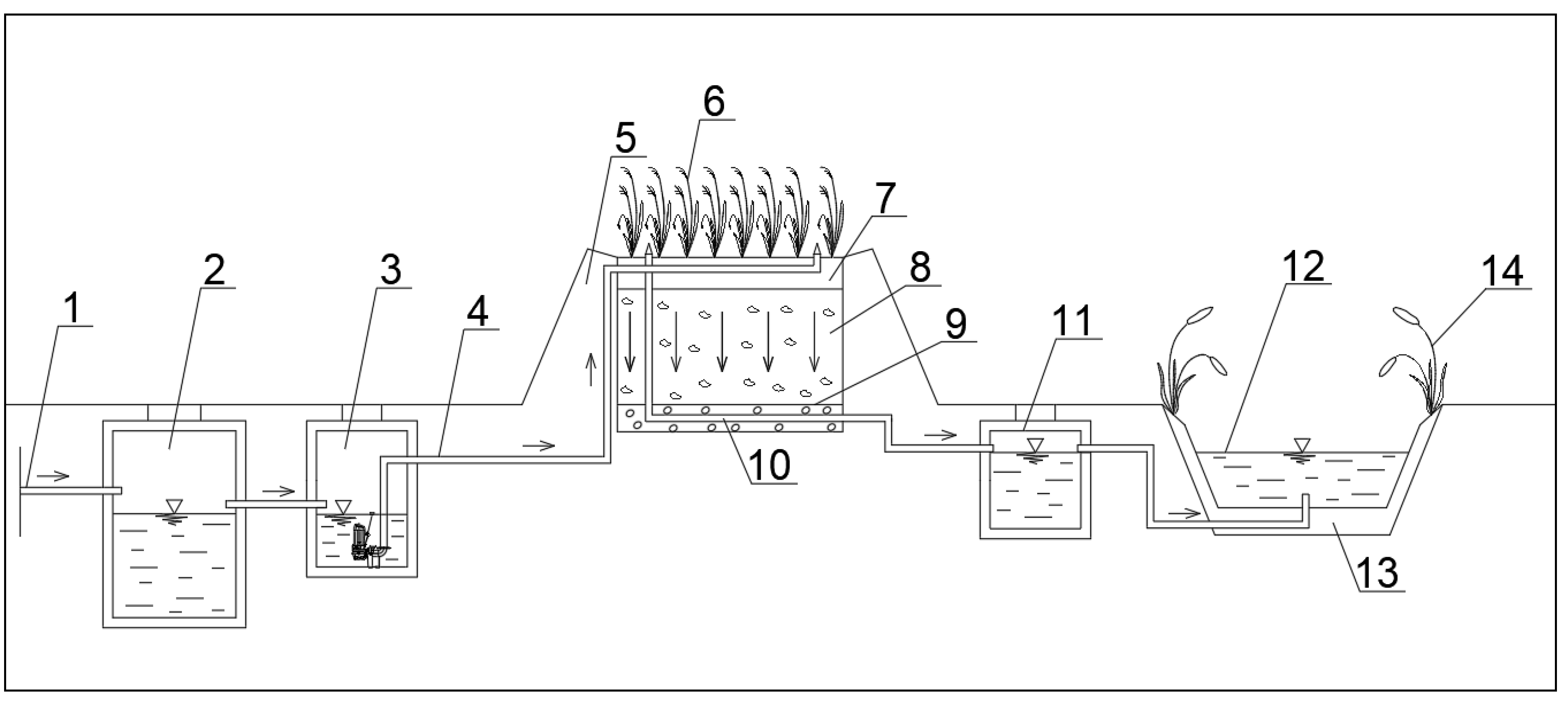 - Physicochemical parameters in the wastewater flowing through the beds, calculated as the average value between the sampling point, pumping station (3), and the wastewater collection point, intermediate well (11): pH, temperature (Temp), dissolved oxygen (DO), alkalinity (Alk), biochemical oxygen demand (BOD5), chemical oxygen demand (COD), total suspended solids (TSS), phosphate phosphorus (P-PO4), phosphorus pentoxide (P2O5), total phosphorus (TP), total nitrogen (TN), ammonium nitrogen (N-NH4), nitrate nitrogen (N-NO3), nitrite nitrogen (N-NO2), chlorides (Cl), iron (Fe);