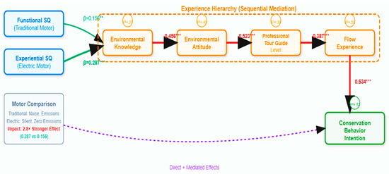 The sequential mediation model demonstrated robust pathways from environmental education participation—delivered through interpretive guided tours—to pro-environmental outcomes. Participation directly enhanced environmental knowledge about lagoon ecosystems and motor impacts (β = 0.234, p < 0.001), which in turn shaped attitudes toward sustainable boating practices (β = 0.456, p < 0.001) (Table 5). These attitudes strengthened perceived professional level of tour guide to aquaculture lagoons (β = 0.523, p < 0.001), promoting immersive flow experiences during tours (β = 0.387, p < 0.001) and ultimately driving intentions for conservation behaviors, such as adopting electric motors (β = 0.534, p < 0.001). Mediation analysis confirmed partial mediation for the full hierarchy (indirect effect = 0.145, 95% CI [0.089, 0.201]), indicating that tours using electric motors amplified ecological awareness by minimizing noise and emissions, thereby facilitating deeper cognitive and affective engagement (Table 6). This aligns with the dual service quality framework, where electric pontoon boats enabled interactive, personalized experiences (e.g., silent observation of aquatic species), contrasting with the efficiency-focused but pollutant-emitting traditional engines, which disrupted ecosystem immersion (Table 7). The significant moderation effects indicate that adequate safety perception and facility quality are necessary conditions for service quality to effectively influence flow experiences (Table 8).