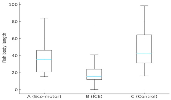 Non-parametric Kruskal–Wallis tests revealed significant differences in body lengths across sites for all species (p < 0.001; Table 11). Post hoc pairwise Mann–Whitney U tests (Bonferroni-corrected) indicated that traditional motor exposure (Site ICE) significantly reduced body lengths compared to the control (Site Control) in C. macrolepis (U = 1245, p < 0.001), N. come (U = 1112, p = 0.002), G. erythrourus (U = 987, p < 0.001), O. sp. (U = 1456, p = 0.004), and M. cephalus (U = 1023, p = 0.001). In contrast, eco-friendly motor exposure (Site Eco) showed no significant differences from Site Control for any species (p > 0.05), suggesting minimal impact.