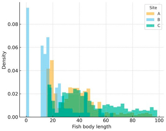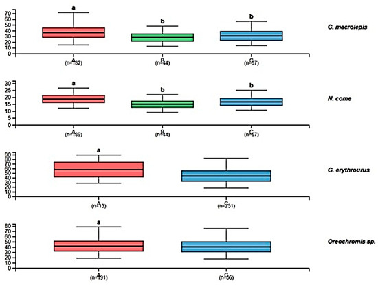 Body length data were available for five dominant species: C. macrolepis, N. come, G. erythrourus, Oreochromis sp., and M. cephalus (n = 182, 189, 251, 191, and 125 measurements at Site Eco, respectively) (Figure 4). Mean body lengths (±SD) varied across sites (Table 11). For instance, C. macrolepis showed reduced mean lengths at Site ICE (24.5 ± 8.2 cm) compared to Site Eco (33.1 ± 7.9 cm) and Site Control (34.2 ± 8.5 cm).