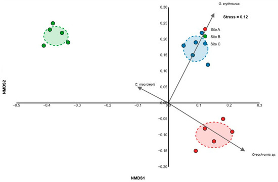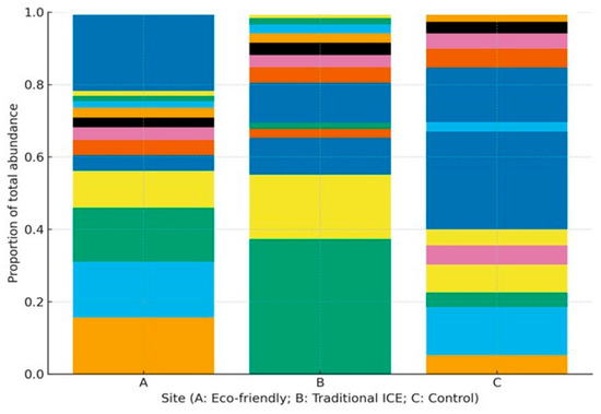 To assess community structure differences, non-metric multidimensional scaling (NMDS) was applied to species abundance data using Bray–Curtis dissimilarity (stress = 0.12, indicating a reliable ordination) [51]. The NMDS plot revealed clear separation between Site ICE and the other sites, with Sites Eco and Control clustering closely. Due to the three replicates per site, permutation-based multivariate analysis of variance (PERMANOVA) was feasible; however, pairwise Bray–Curtis distances showed greater dissimilarity between ICE and Control (0.68) than between Eco and Control (0.32), supporting qualitative evidence of impact from traditional motors. Shannon diversity indices (H’) were calculated as follows: Site Eco (H’ = 3.45), Site ICE (H’ = 2.78), Site Control (H’ = 3.62). Wilcoxon rank-sum tests (non-parametric, due to non-normal data distribution confirmed by Shapiro–Wilk tests, p < 0.05) on abundance per species indicated significantly lower median abundance at Site ICE compared to Site Control (Z = −2.87, p = 0.004), but no significant difference between Site Eco and Site Control (Z = −0.92, p = 0.36). Kruskal–Wallis tests across all sites confirmed overall differences in abundance (χ2 = 12.4, df = 2, p = 0.002), with post hoc Dunn’s tests highlighting ICE vs. Control (p = 0.001) and ICE vs. Eco (p = 0.003) as significant.