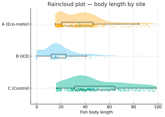 This study was conducted in the Cigu Lagoon system, part of Taijiang National Park in Tainan, Taiwan. The study sites were specifically located within Cigu Creek, Liucheng Creek, and Xiashan Creek. The riparian zones of these waterways are characterized by mangrove forests, and the benthic substrate is composed of a relatively uniform mixture of fine sand and mud. A total of six fixed fyke nets were deployed for the experiment, with two replicate nets at each of the three sampling sites. Site Eco was established in Cigu Creek (N: 23.117771, E: 120.102591), an area where local boat operators predominantly utilize eco-friendly motors. Site ICE was situated in the Liucheng Creek (N: 23.137184, E: 120.113330), and Site Control was a randomly selected location in Xiashan Creek (N: 23.146105, E: 120.087688). The study was conducted from May to September 2024, a total of five months, with sampling occurring at least once per month. Nets were deployed for 12-h overnight periods, typically from 6:00 p.m. to 6:00 a.m., to capture nocturnal aquatic fauna. Water quality parameters were measured at each site, with dissolved oxygen (DO) ranging from 4–11 mg/L and salinity ranging from 3–37‰. Raincloud plots combine a half-violin (KDE density), a minimalist boxplot, and jittered points to visualize both the distribution shape and robust summaries. The study computed KDEs on raw individual lengths, and on log1p-transformed species counts (per site across species).