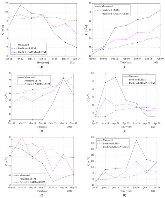 The graphical analysis of Figure 8 shows that the values forecasted with the LSTM + ARIMA hybrid model are generally closer to the measured values compared to the predictions obtained with the simple LSTM network.