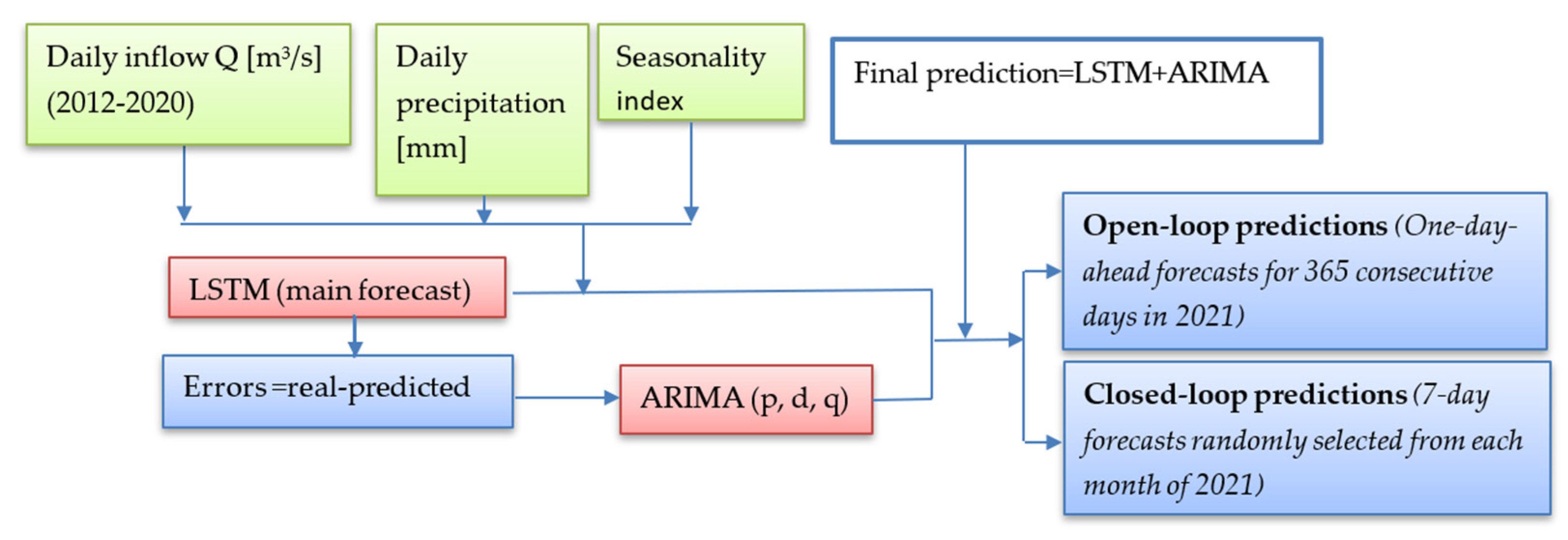 While other AI-based models, such as feedforward neural networks or other similar architectures, may provide higher accuracy for day-ahead prediction compared to LSTM, they have limited generalizability for forecasts over a seven-day horizon. Consequently, for the short-term forecast (seven days in advance) the use of LSTM networks was chosen, which allows the learning of long-term dependencies from the time series. Moreover, it was observed that the integration of the ARIMA model for adjusting LSTM errors leads to a high-performance combination for the seven-day forward forecast, in a closed-loop mode, without daily updating of the real values of the time series during the prediction horizon.