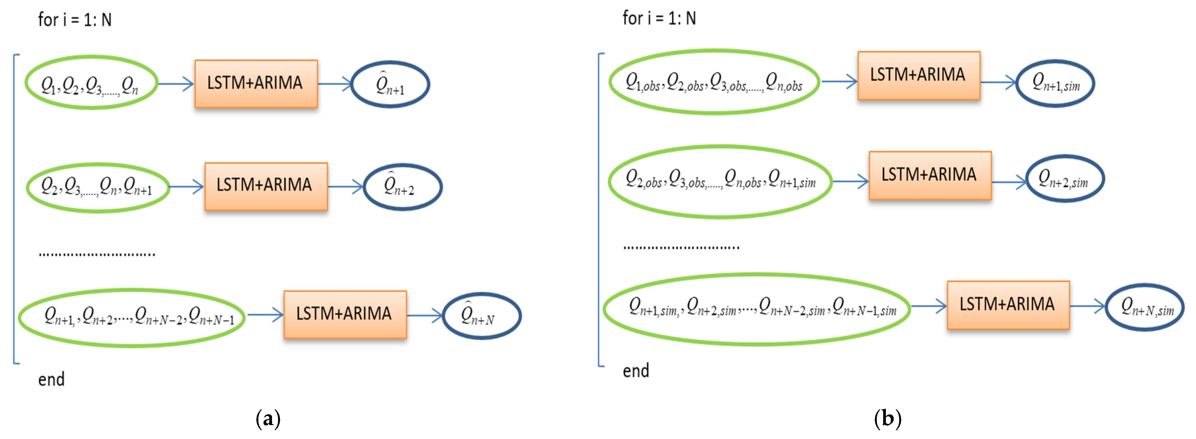 35], the authors investigated the performance of multi-step forecasting of tributary flows in reservoirs using an encoder–decoder time-variant approach, applied to 12 different case studies. The results indicate that while the accuracy of the short-term forecast (one day ahead) is high, with