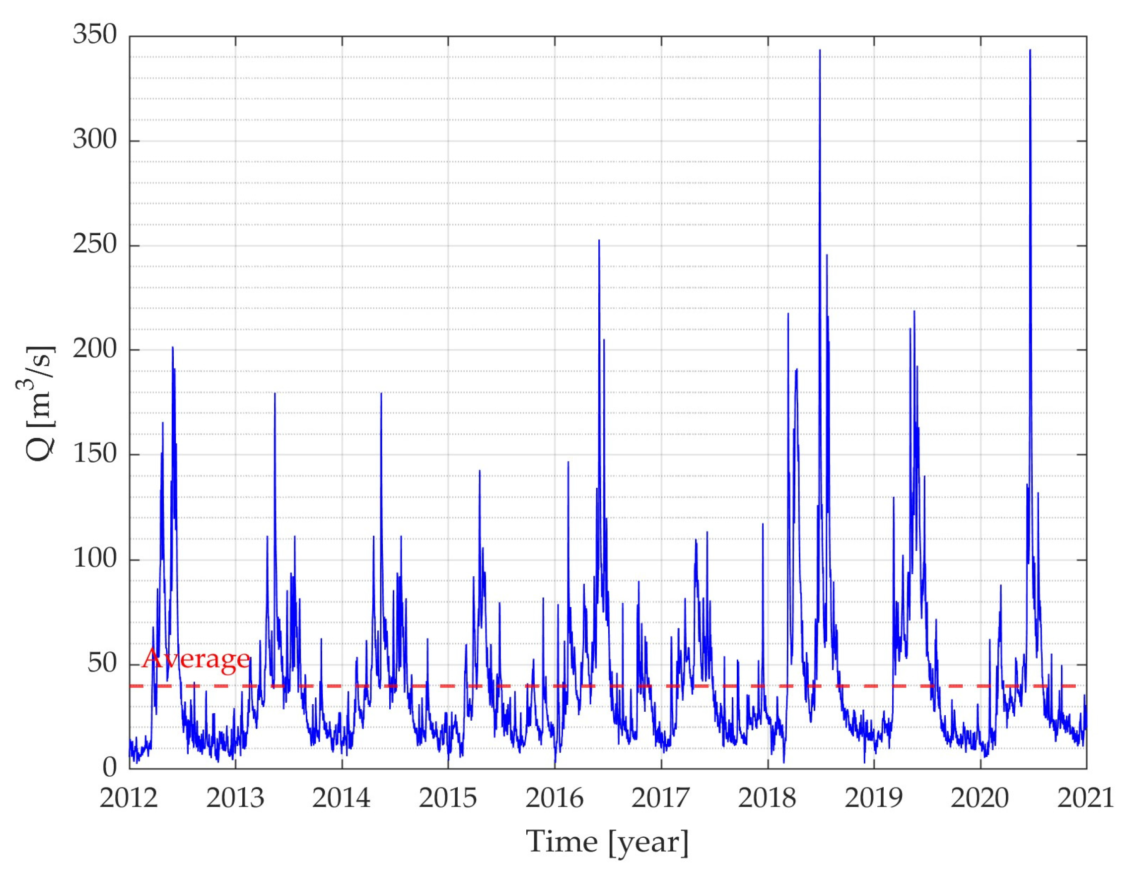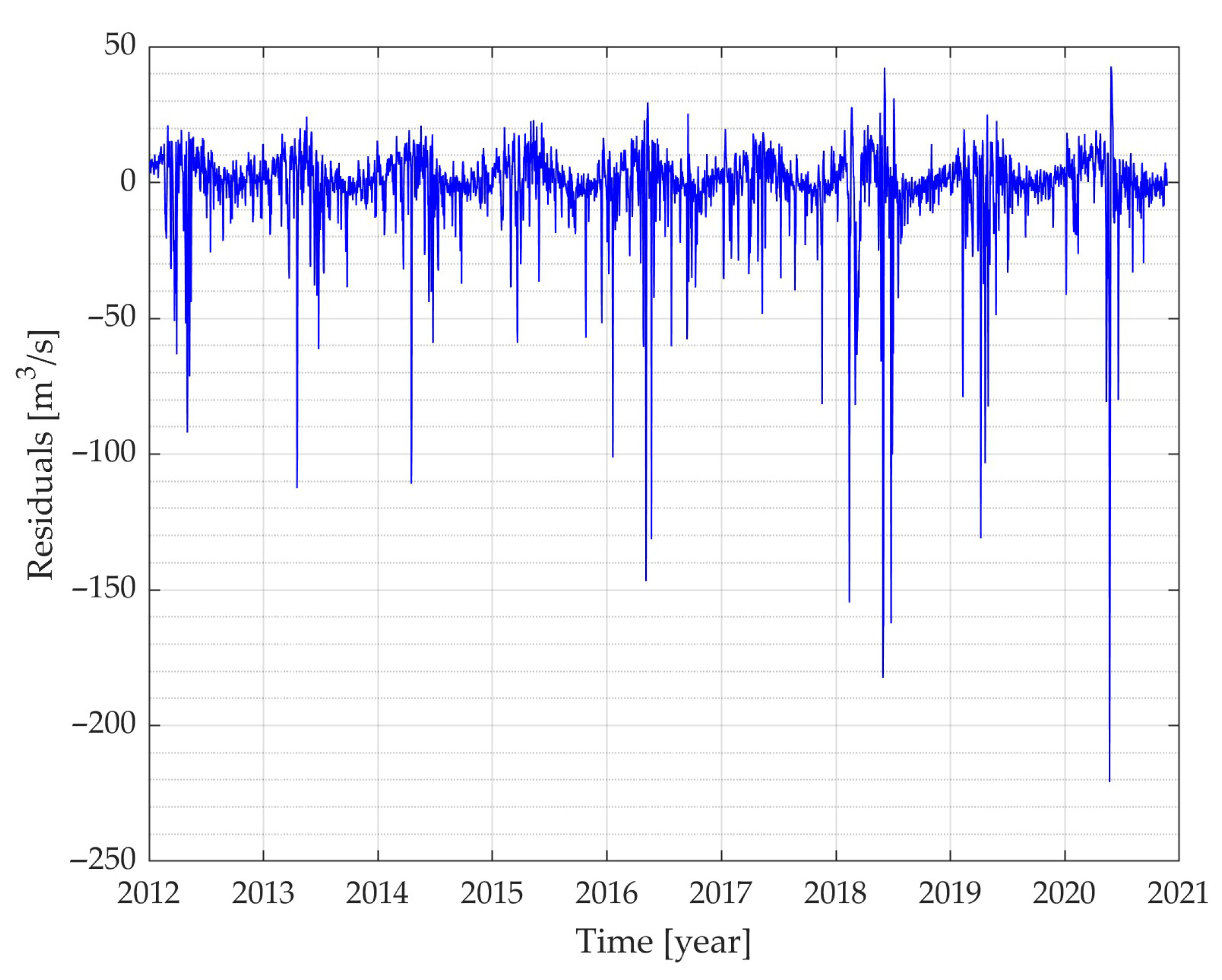Figure 4 presents the chronologically recorded daily inflows in the reservoir in the 2012–2020 period used for model calibration, providing an overview of the seasonal and interannual variability within the dataset.