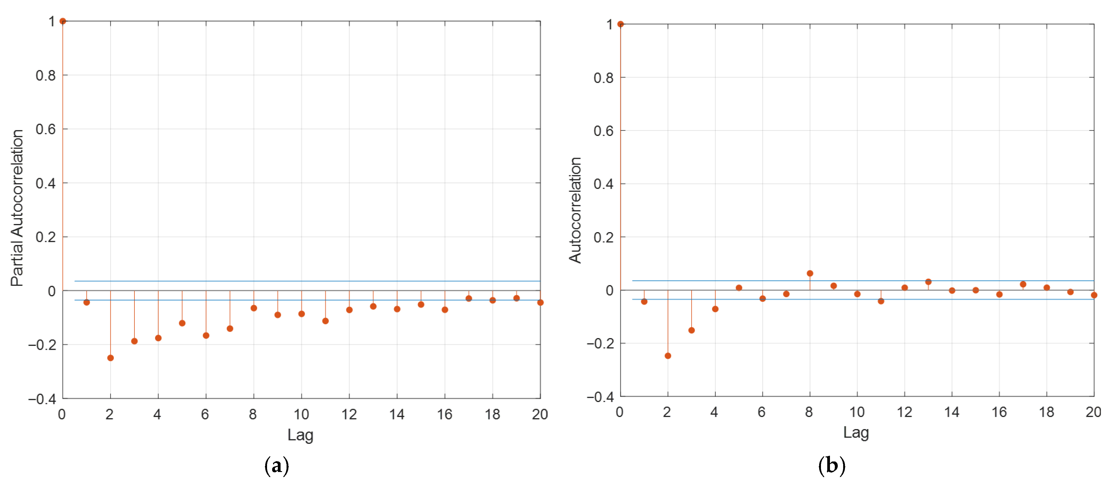 d) to achieve stationarity was found to be one. For this purpose, the autocorrelation function (ACF) and partial autocorrelation function (PACF) were graphically represented (