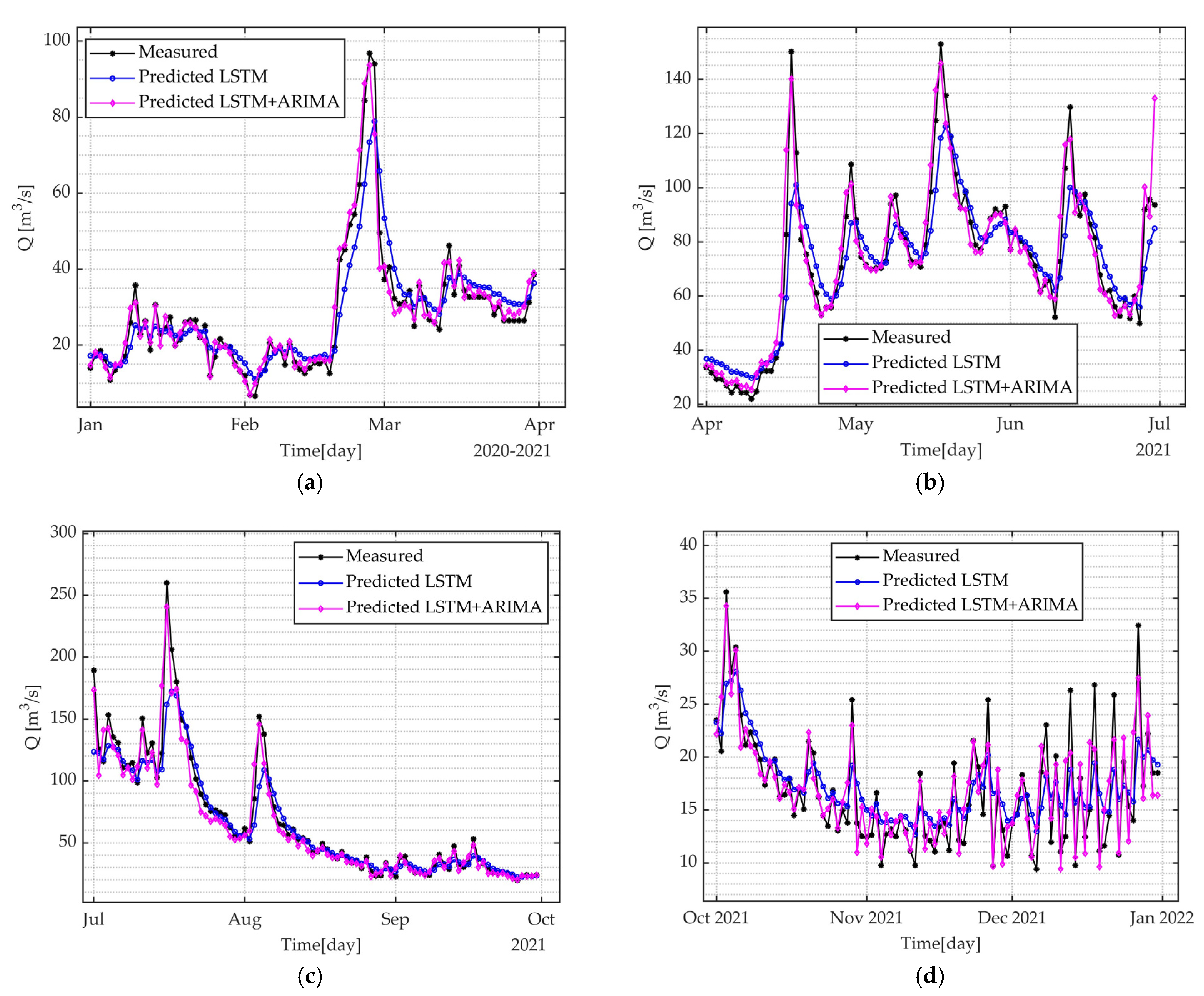 In contrast, the hybrid LSTM + ARIMA model yielded superior results on the test set, with an RMSE of 12.74 m3/s, R2 of 0.89, and NSE of 0.87—outperforming all other models. These outcomes further demonstrate the robustness and predictive superiority of the hybrid approach, particularly under conditions characterized by high temporal variability and nonlinear dependencies. Such performance highlights the advantage of integrating statistical and deep learning components for capturing complex hydrological dynamics.