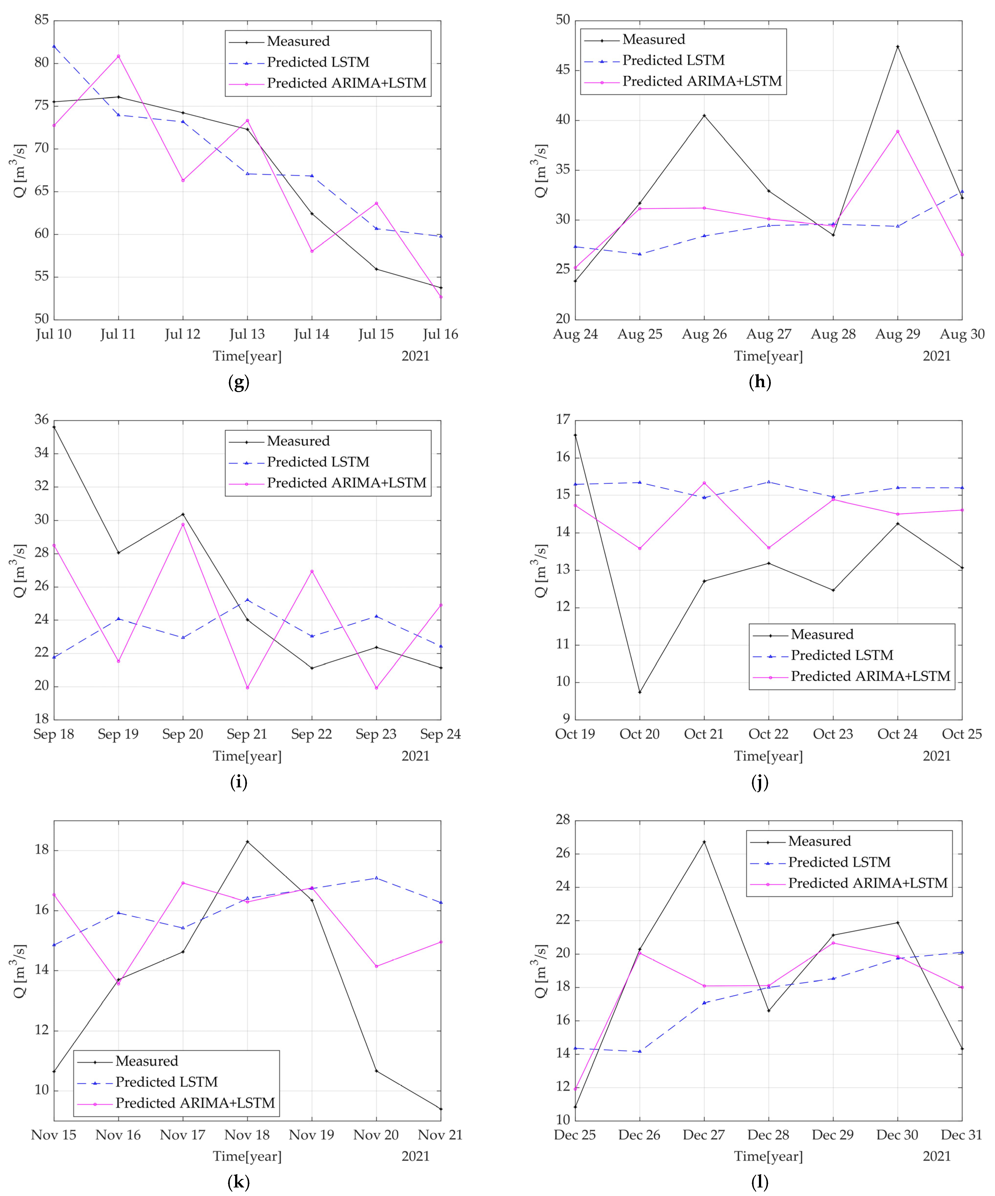 Figure 8 shows that the values forecasted with the LSTM + ARIMA hybrid model are generally closer to the measured values compared to the predictions obtained with the simple LSTM network.