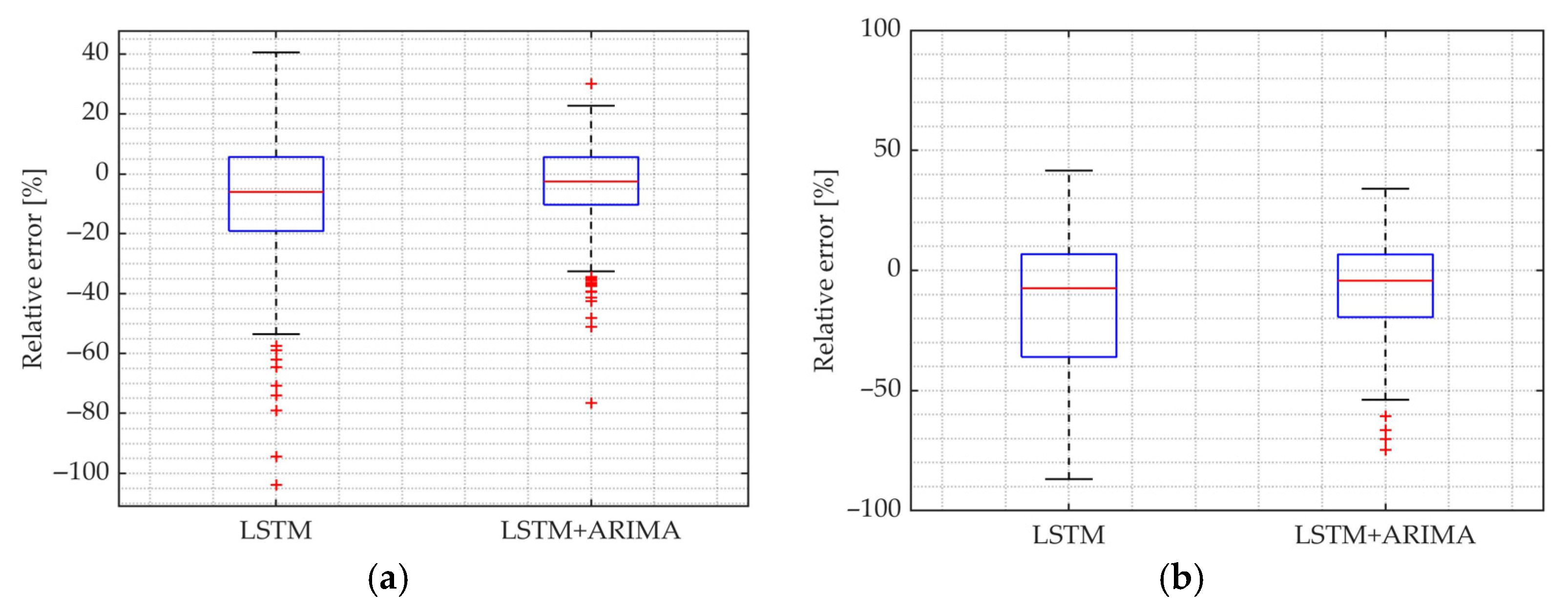 Figure 9b), the LSTM + ARIMA model displays a narrower range of variation, reflecting more consistent performance across selected days. While LSTM continues to generate significantly negative outliers, those from the hybrid model remain closer to zero. The median error again indicates better performance for LSTM + ARIMA, highlighting its ability to reduce systematic bias and enhance predictive reliability.