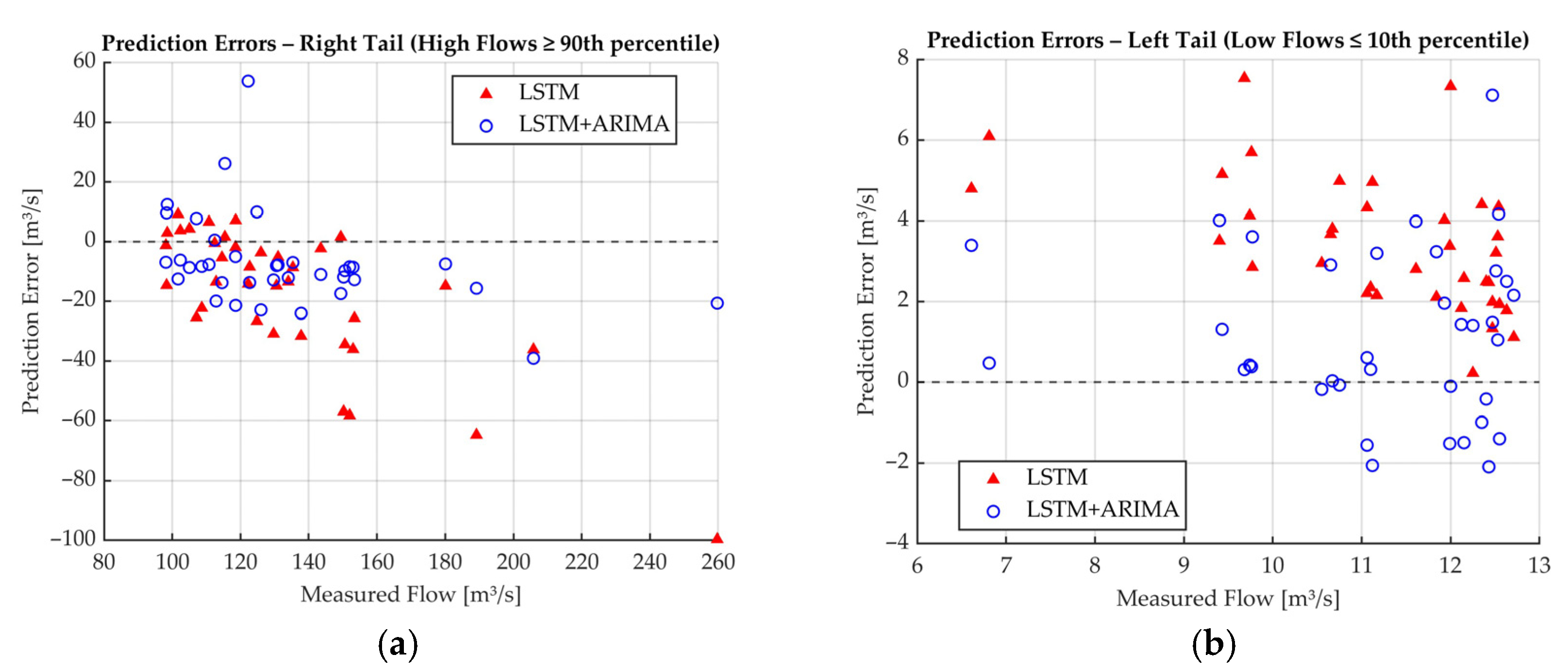 Figure 10 presents the error patterns for both models, LSTM and LSTM-ARIMA, across these extremes. The horizontal axis represents the observed inflow, while the vertical axis shows the prediction error. This visualization allows for a direct comparison of model behaviour in rare but impactful scenarios, with errors computed as the difference between measured and predicted flows within the 90th and 10th percentile ranges.