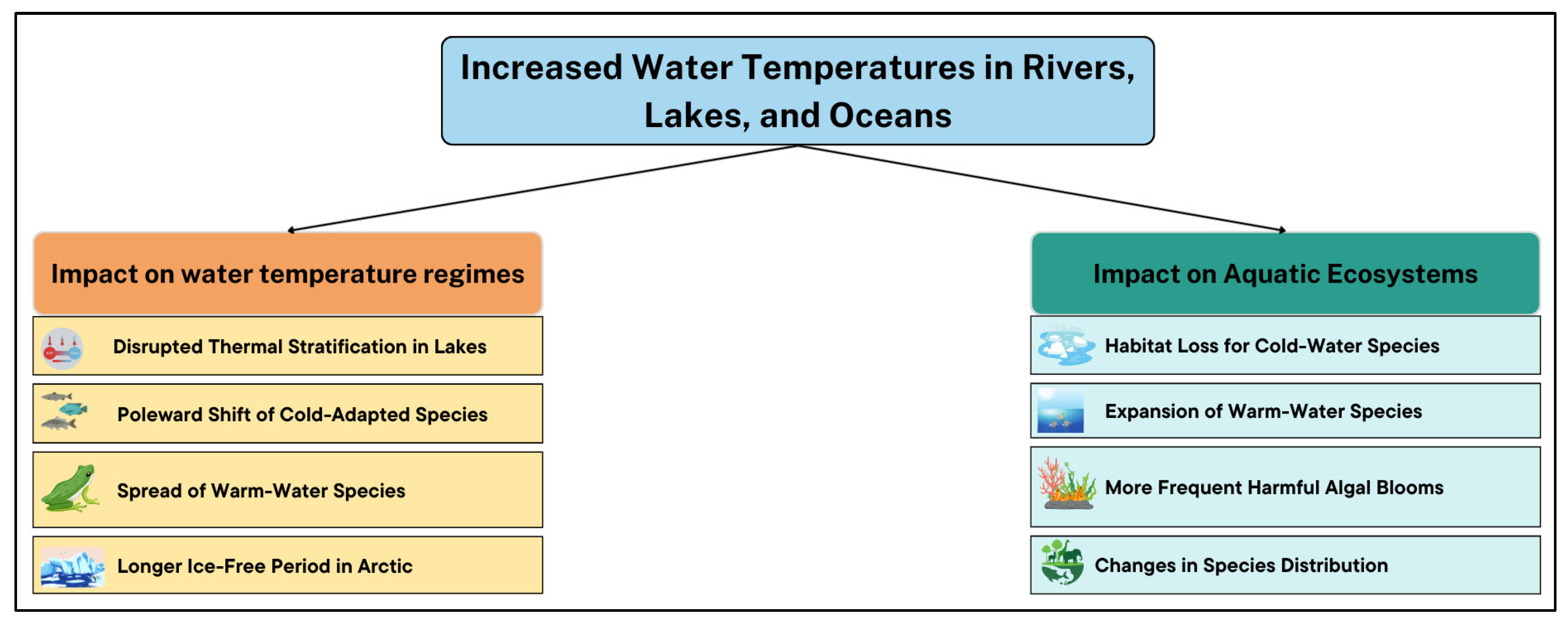 | Lakes (deep and large) | LSWT rise ~0.34 °C per decade globally; stronger stratification; hypoxia; more frequent heatwaves; increased algal blooms; reduced ice cover in >5000 lakes | Oxygen depletion, fish die-offs (6–34× increase projected), reduced cold-water habitats, expansion of warm-water fish, trophic instability | [8,11,16,21,22,67,68,74,101,102,103,104,105] |