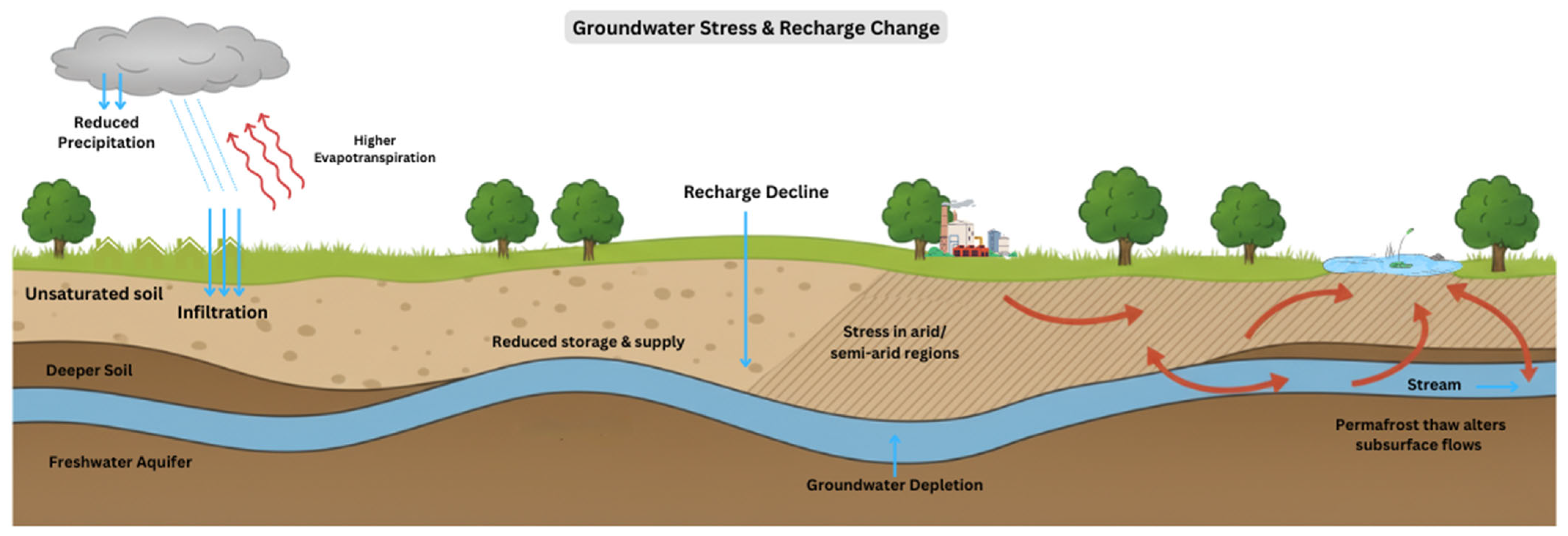 | Groundwater | Declining recharge in arid/semi-arid zones; permafrost thaw altering flows; over-extraction worsens stress | Lower water tables, salinization, quality degradation, destabilized aquifers | [43,44,45,46] |