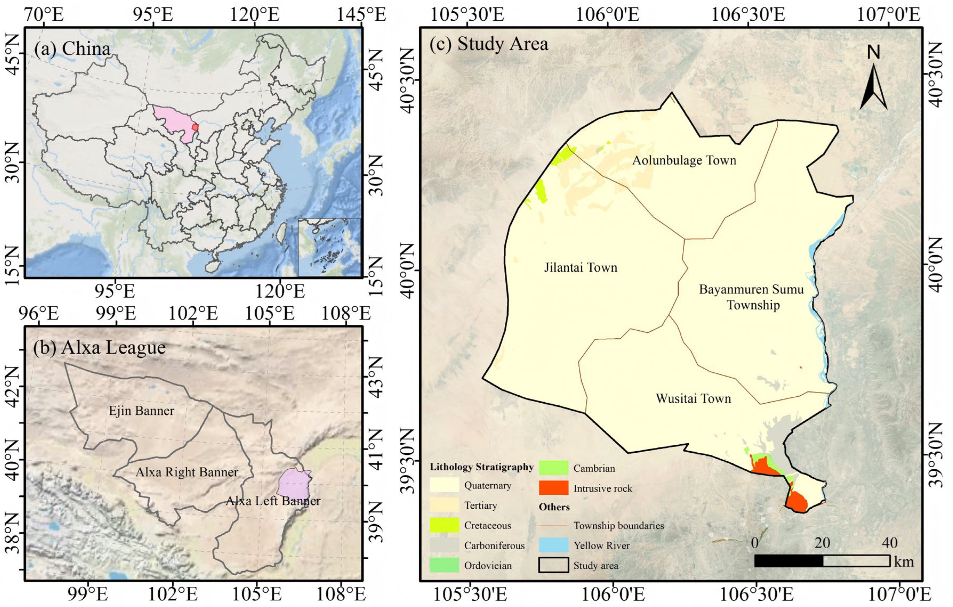 - Chen, F.; Li, G.; Zhao, H.; Jin, M.; Chen, X.; Fan, Y.; Liu, X.; Wu, D.; Madsen, D. Landscape evolution of the Ulan Buh Desert in northern China during the late Quaternary. Quat. Res. 2014, 81, 476–487. [Google Scholar] [CrossRef]