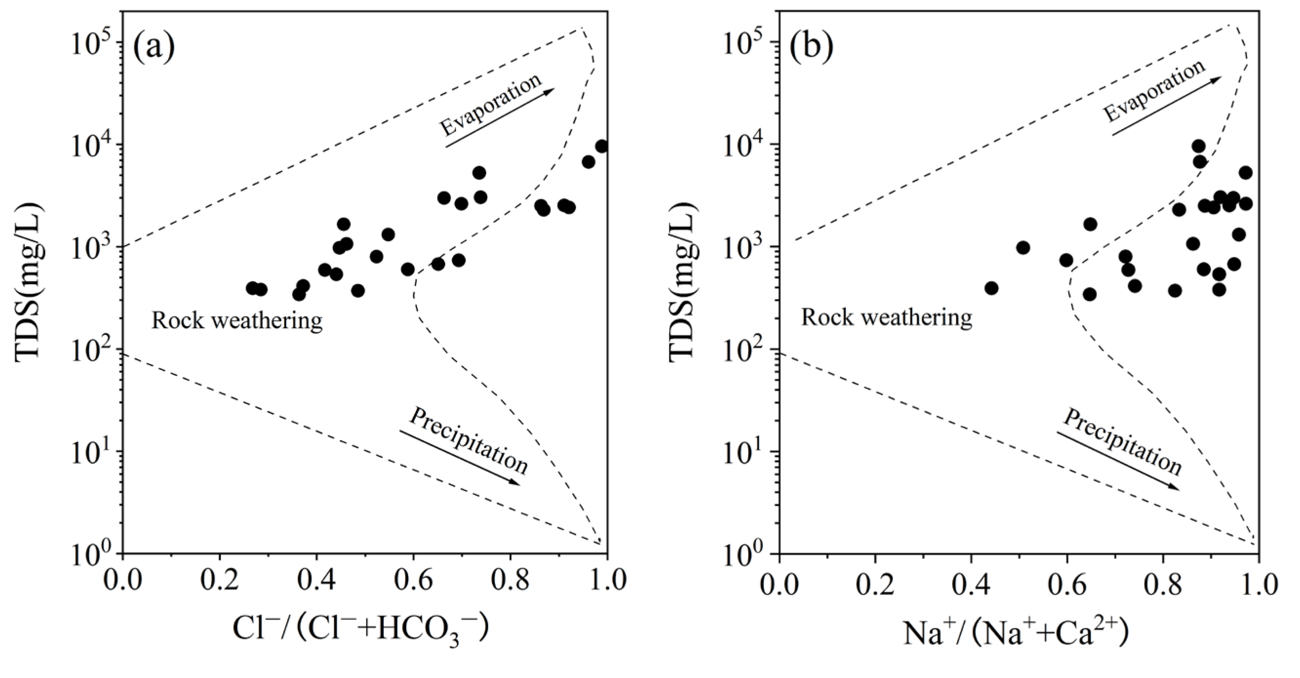 - The hydrochemical characteristics of groundwater in the study area are governed by multiple geohydrological processes. Piper diagram shows that its hydrochemical types are mainly HCO3− type and Cl− type. The high salinity of groundwater is mainly due to the dissolution, evaporation and concentration of carbonate minerals and ion exchange process. Rock weathering is the dominant factor, but evaporation and concentration also significantly enhanced groundwater mineralization in some areas.