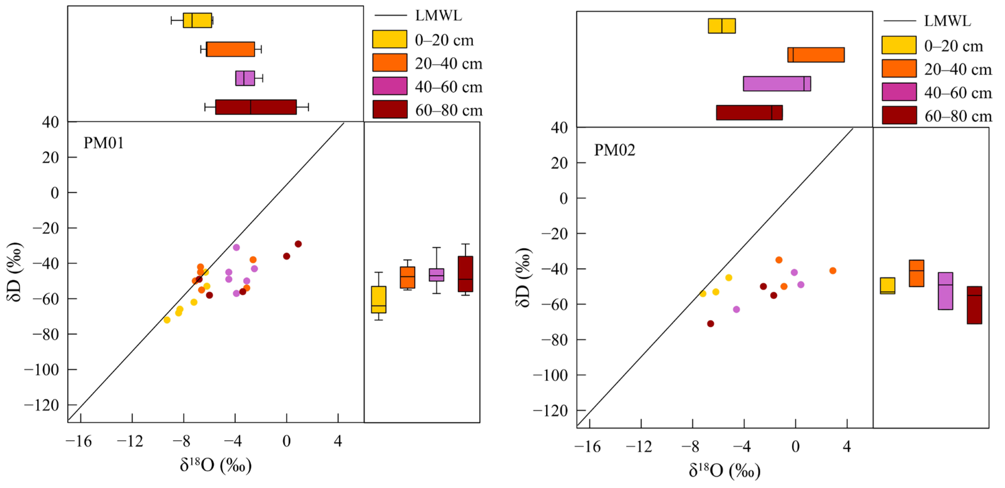 - Soil water isotopes exhibit significant vertical stratification, revealing a hydraulic connection between the enriched deep layer (60–80 cm) and groundwater. This suggests capillary rise recharge into the vadose zone, which vegetation subsequently accesses indirectly via the soil matrix rather than through direct uptake.
