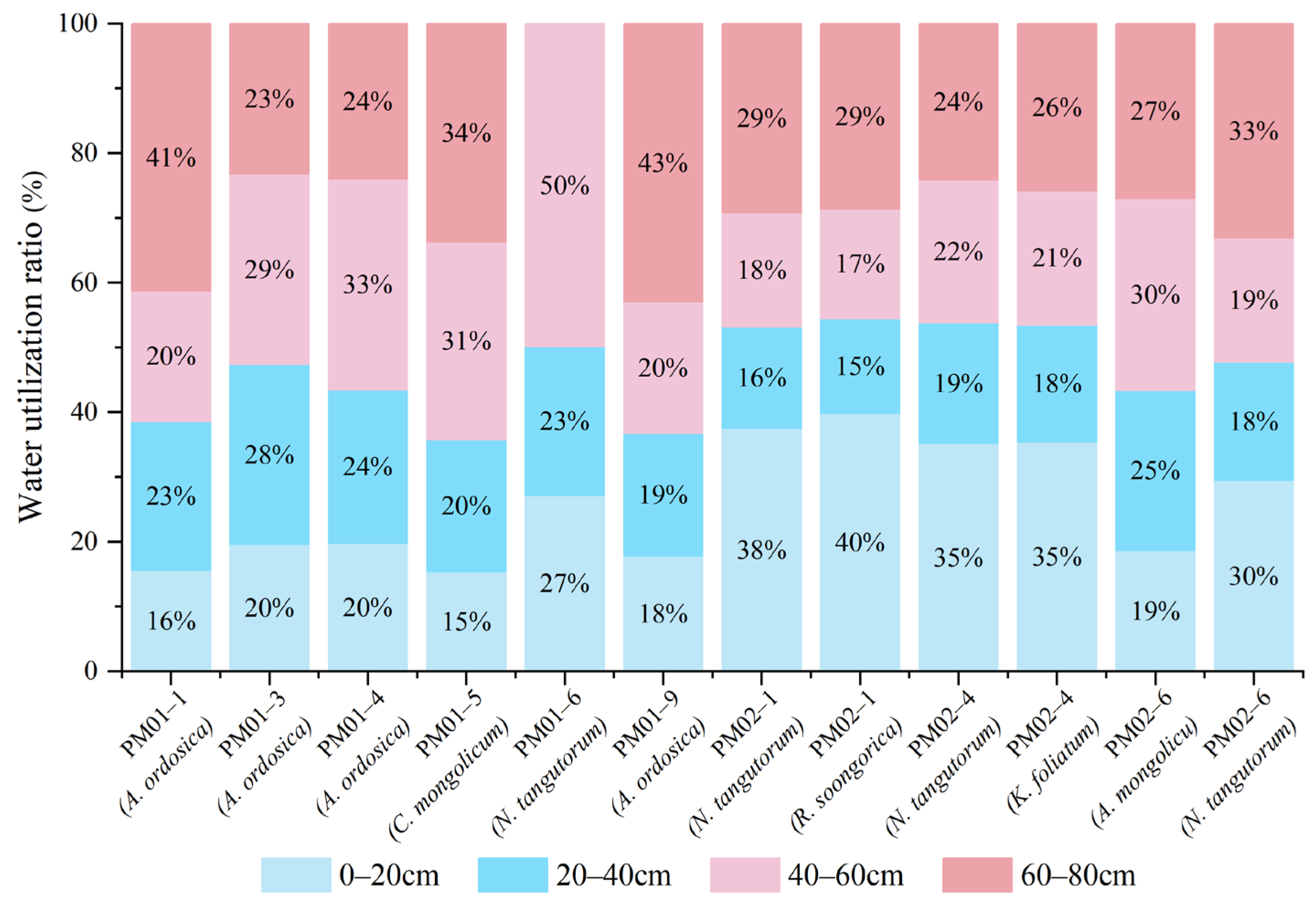 - Vegetation exhibits distinct depth-stratified water use strategies. Shallow-rooted species (e.g., R. soongorica, K. foliatum) primarily rely on shallow soil water (0–20 cm), while deep-rooted plants (e.g., N. tangutorum, A. mongolicus) predominantly utilize deeper soil moisture (40–80 cm). No direct groundwater dependence was observed.