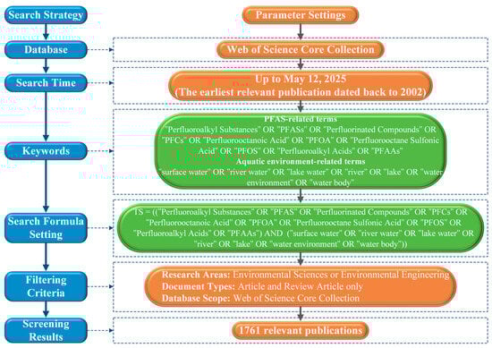 Literature on PFAS pollution in river and lake environments published between 2002 and 2025 was retrieved from the Web of Science (WoS) Core Collection, with the data sources and search strategy presented in Figure 1. The search was limited to research articles and review papers. Each record was manually screened by title, author keywords, and abstract to exclude irrelevant studies, those with mismatched research subjects, or duplicate and redundant publications, resulting in a final dataset of 1761 articles.
