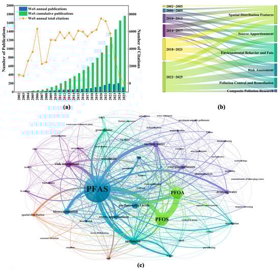 As shown in Figure 2a, the number of publications related to PFASs in river and lake water environments within the WoS Core Collections has exhibited significant annual growth. The total publication count steadily increased from 4 in 2002 to 1761 in 2025. Annual total citations began fluctuating upward around 2010, peaking between 2019 and 2021. Citations have slightly declined in recent years, primarily because the newly published literature has had a short accumulation period and still needs time to consolidate. Nevertheless, the overall trend remains upward.