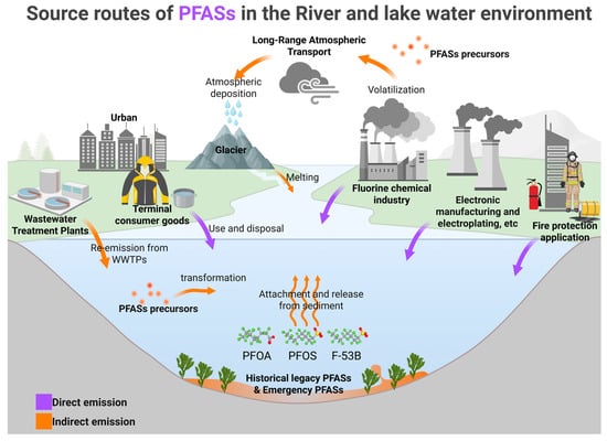 PFASs are primarily derived from anthropogenic activities and are not naturally produced in the environment [54,55]. Their pollution sources primarily include the production, use, and disposal of industrial, commercial, and consumer products, with their inputs into rivers and lakes categorized into direct emissions and indirect emissions (Figure 3).