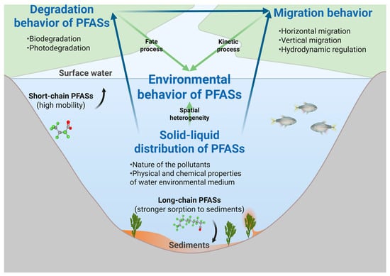 PFASs entering river and lake systems typically exhibit distinct distribution characteristics across environmental media such as surface water and sediments. These patterns are primarily governed by a series of environmental behaviors of PFASs in aquatic systems, including their partitioning, degradation, and transport (Figure 4).