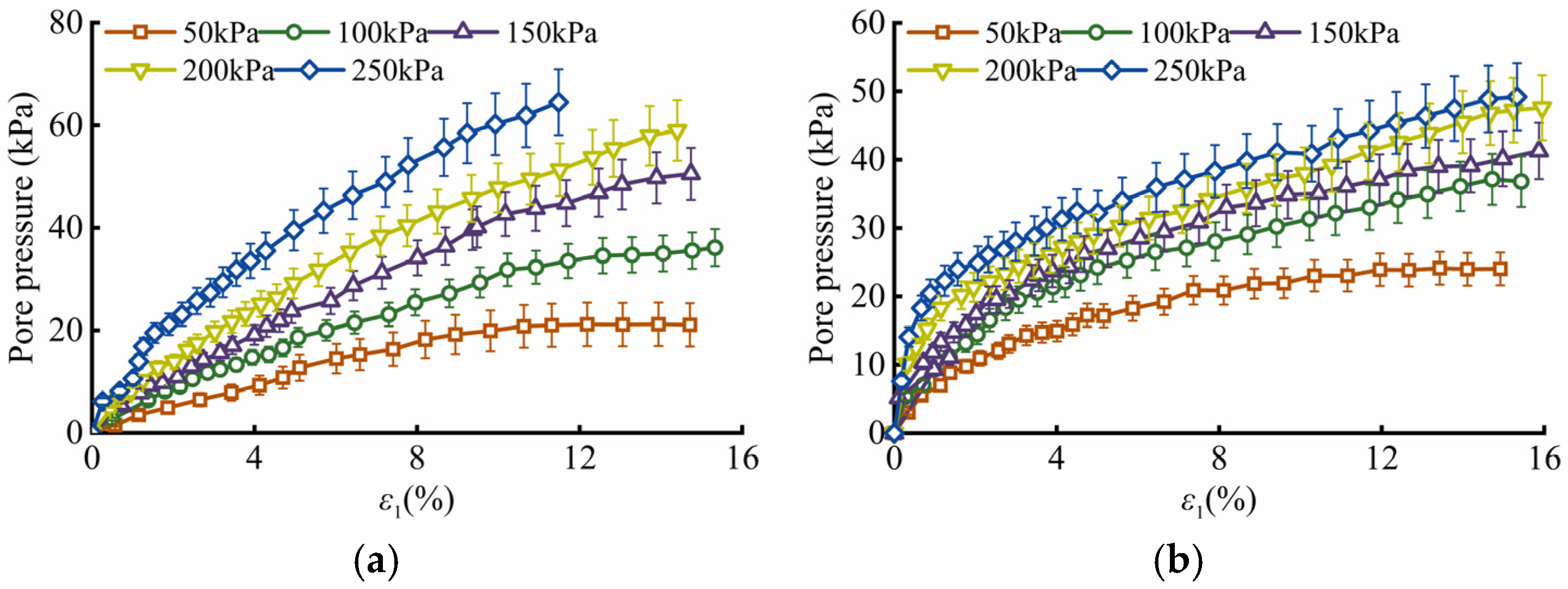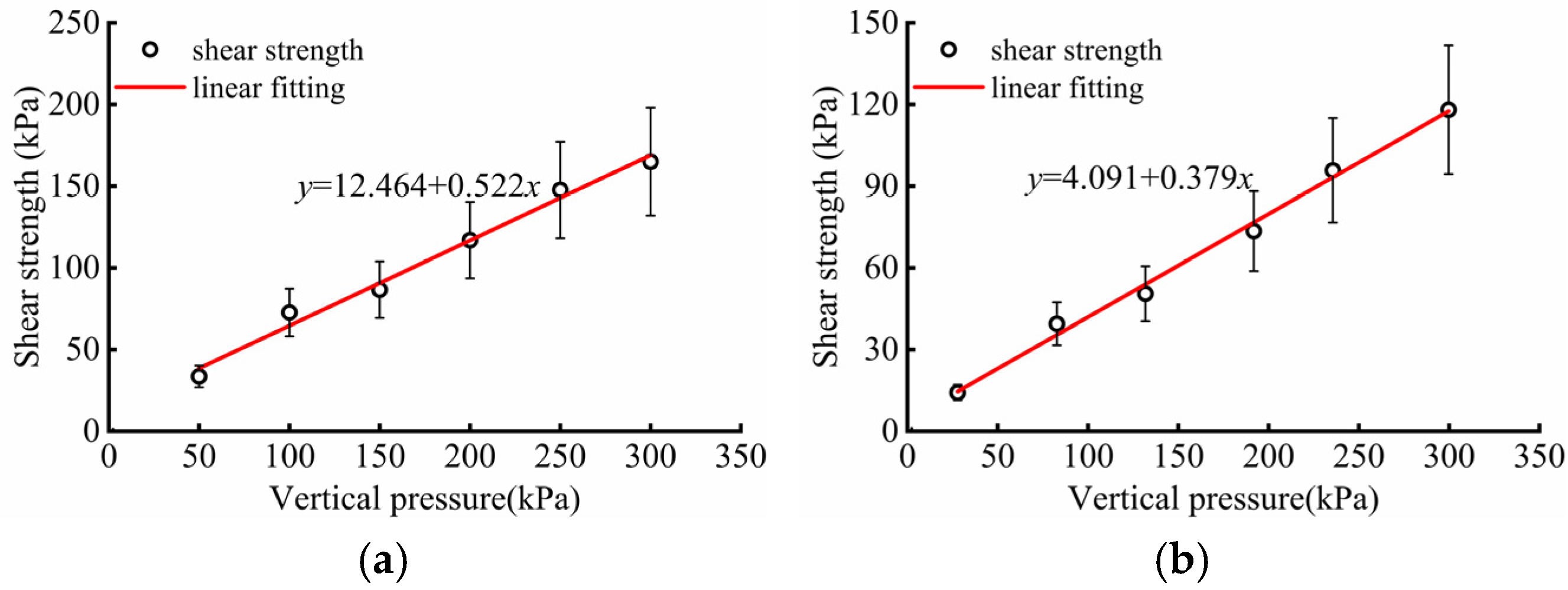 - The compression curve of soft soil exhibits significant nonlinear characteristics, with the apparent compressibility of silt being higher than that of silty clay. The compression and rebound coefficients of soft soil were determined from experimental data. As consolidation pressure increases, the deviatoric stress of soft soil rises significantly, demonstrating typical strain-hardening behavior. Based on these results, the effective stress ratio M for both types of soft soil was derived. A quantitative relationship between shear strength parameters c and φ and the degree of consolidation was established, and the evolution pattern of pore pressure was summarized. Interface characteristic tests were conducted to obtain the c and φ at the interfaces between bags and sand, as well as between adjacent bags.