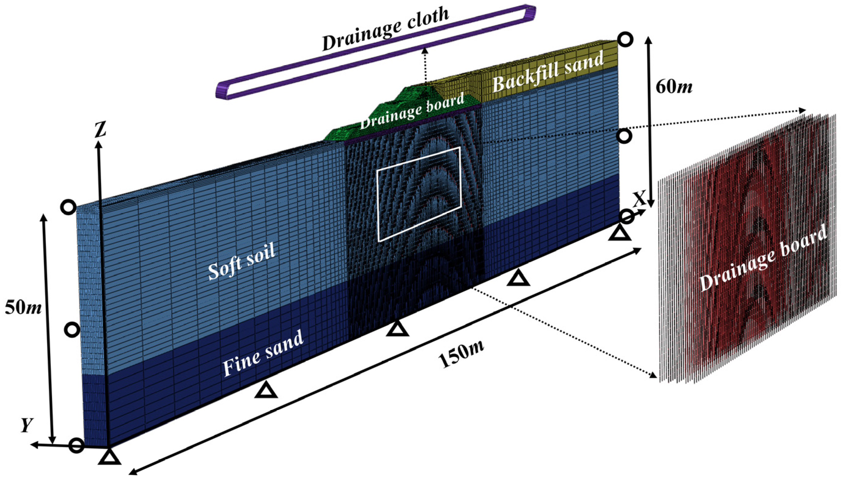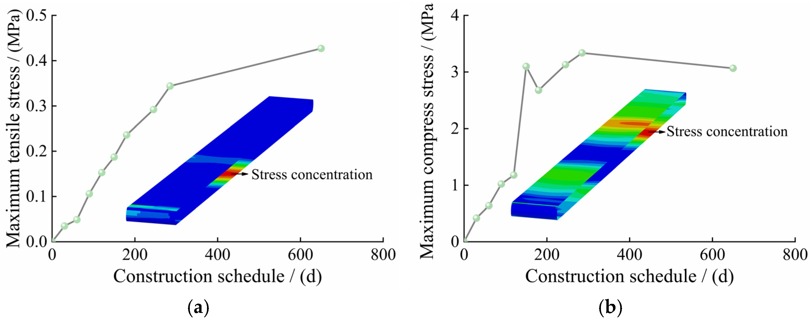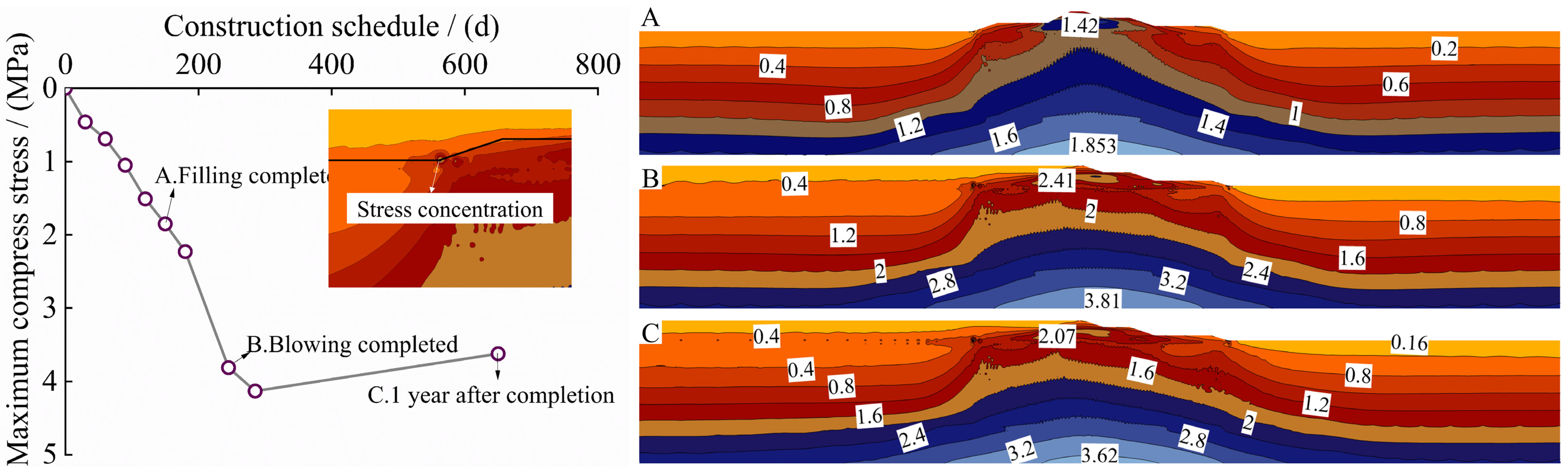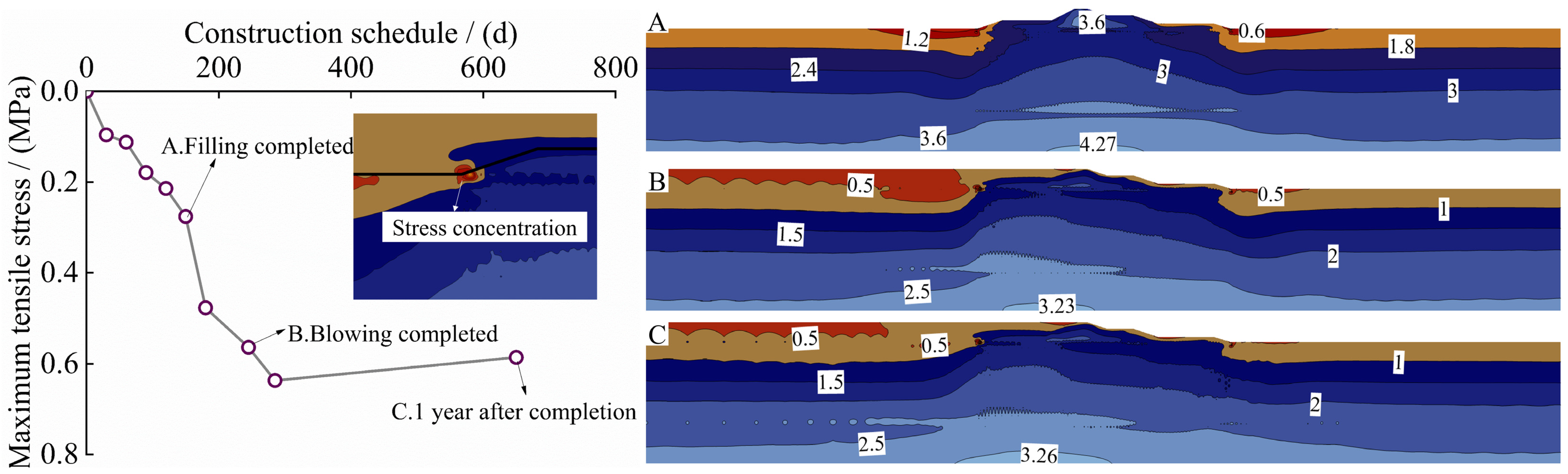- As hydraulic filling proceeds, the overall structure gradually transitions into a more pronounced tensile state, with stress concentration at the slope toe becoming increasingly evident. One year after completion of filling, tensile stress slightly decreases. The GPB structure remains under tension throughout, with the maximum tensile stress occurring in the central region. However, all peak tensile stresses remain below the material’s allowable stress limit. Drainage boards effectively accelerate pore pressure dissipation, which is nearly complete within one year after construction ends.
