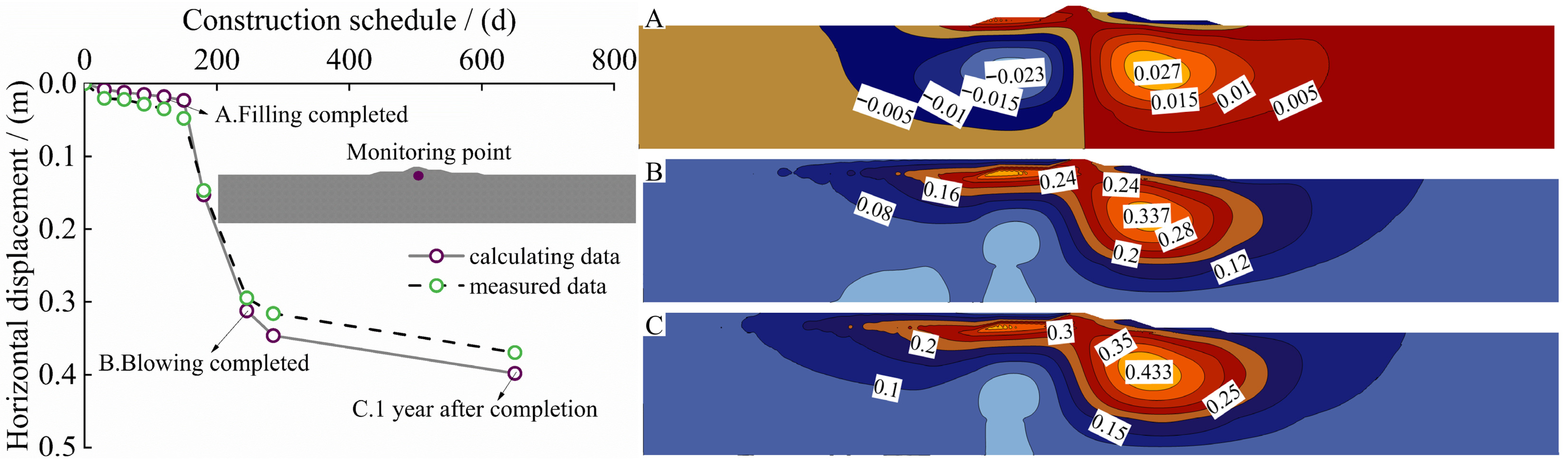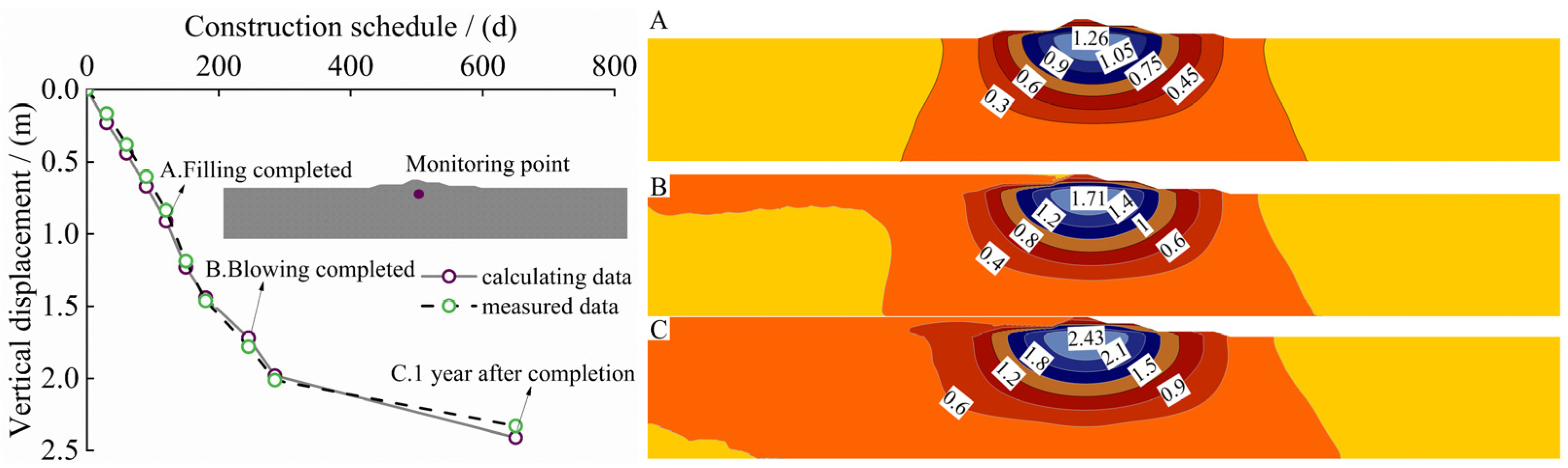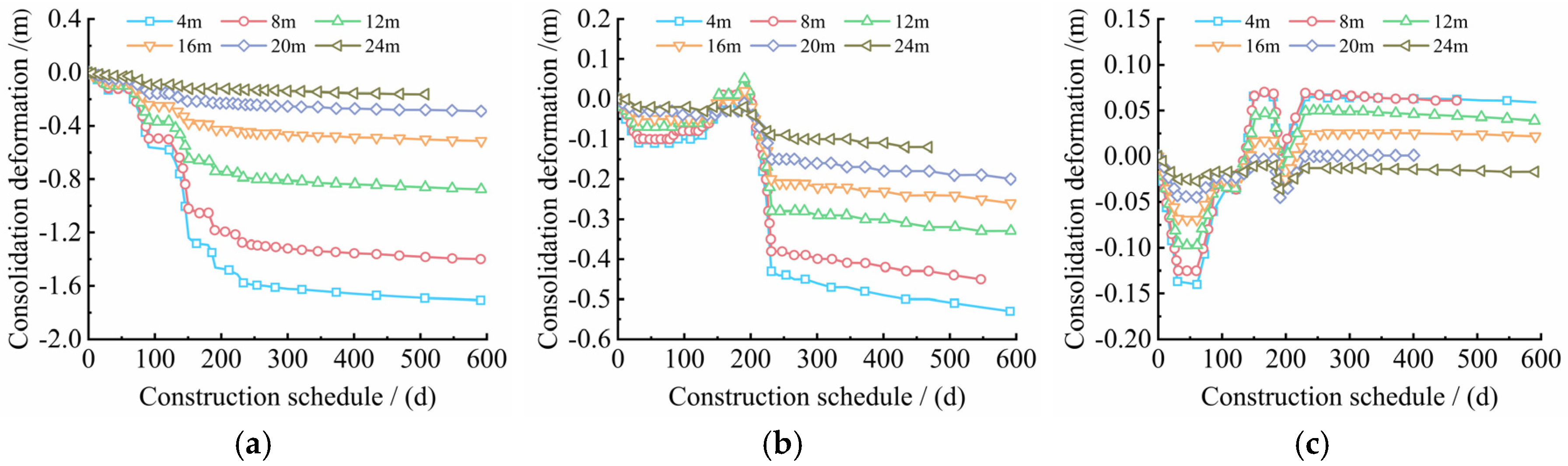 - A three-dimensional refined numerical model of the GPB structure was developed. Simulation results indicate that foundation settlement progressively increases with construction advancement. During construction breaks, the drainage boards facilitate drainage, effectively reducing the settlement rate. Horizontal displacement is highly influenced by the hydraulic filling process; when the upper fill is asymmetrically placed, uneven horizontal displacements occur across the foundation.