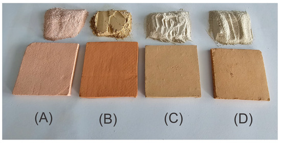 To prepare the membranes, 125 g of clay powder was mixed with 50 mL of water in a plastic container and manually kneaded until a homogeneous, plasticine-like consistency was achieved. The resulting paste was rolled and shaped into square plates (6.5 cm × 6.5 cm, 0.5 cm thick). The plates were placed between two acrylic sheets with an absorbent interlayer to ensure uniform drying and to prevent warping. Later, a glass container filled with water, with a total weight of 1 kg, was placed on the acrylic surface for 72 h in a shaded environment, followed by 24 h of sun exposure. Plates were then oven-dried at 105 °C for 2 h (Felisa FE-291AD, Guadalajara, México) and sintered in a muffle furnace (Whisterm Wisd J2) at 650 °C for 1 h with a controlled ramp rate of 10 °C/min, yielding the final ceramic membranes (Figure 1).