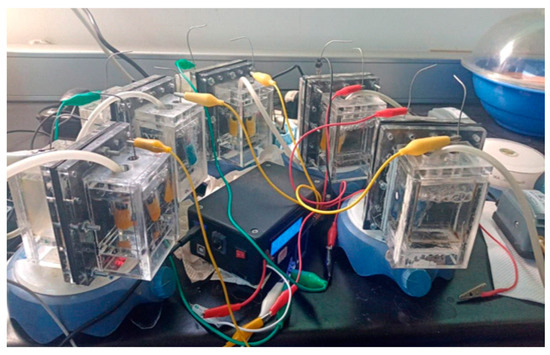 A conventional MFC consists of an anode and a cathode chambers separated by a membrane. In the anodic compartment, microorganisms oxidize biodegradable organic matter, releasing electrons that cross the anode and then flow through an external circuit to the cathode where they reduce an electron acceptor—typically oxygen—forming water or hydrogen peroxide [5]. Concurrently, protons produced in the anode chamber migrate through the membrane to the cathode to complete the electrochemical reaction. MFCs have been successfully applied to a wide range of wastewaters, including domestic, industrial, and agricultural effluents, showing promising removal efficiencies and power output values [6,7,8].