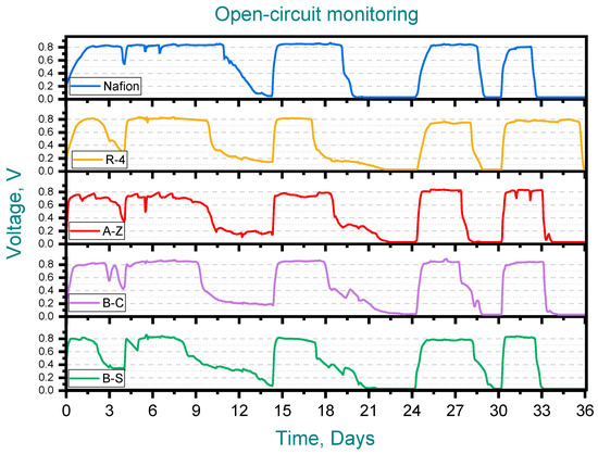 Figure 3 shows the performance of the ceramic membrane MFCs during the first (open-circuit) stage. In all cases maximum voltage outputs were consistently within the range of 0.75–0.85 V, reflecting values that are similar to those observed with Nafion. Also, a progressive reduction in the duration of the feeding cycles was observed, decreasing from 6 to 3 days for most membranes, including Nafion. However, the MFC with the R-4 membrane exhibited atypical behavior in the final cycle, requiring twice as long (6 days) to complete.