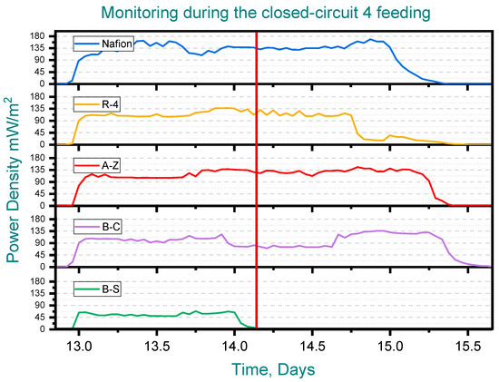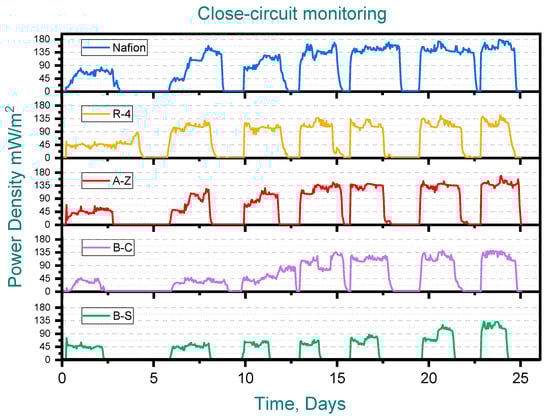 During the second (closed-circuit) stage, voltage, current and power densities were recorded over seven runs across 25 days (See Figure 4). Considering the power generated at the initial stage, ceramic membrane MFCs produced ~40 mW/m2, while Nafion delivered ~80 mW/m2. However, during successive feedings of synthetic wastewater into the MFCs, the maximum power density recorded was 180 mW/m2 for Nafion, 170 mW/m2 for A-Z, 145 for R-4 and 140 for B-C. The lowest performing membrane in this stage was B-S (120 mW/m2). It is important to note that the normalization of power output was carried out with respect to the cross-sectional area of the anode (5 × 5 cm).The results obtained are consistent with previous studies, where comparable performance values have been reported for both unmodified and modified clay-based membranes [24,25,28].