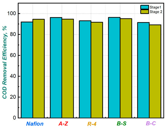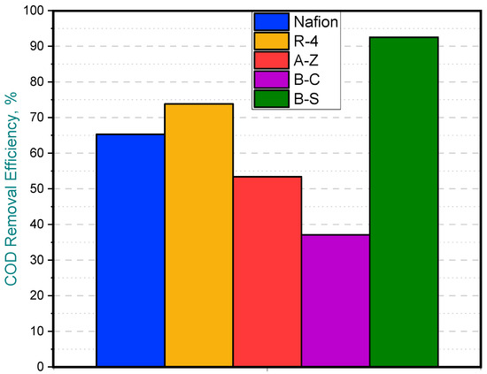 When water samples were taken from the anode chamber at the point where the potential of the first cell dropped to zero—while the remaining cells continued generating potential—the chemical oxygen demand (COD) of the solution was analyzed. Clear differences in COD removal were observed at this point, marked by red line (See Figure 6). In the B-C cell, where the voltage had already fallen to zero, COD removal reached 92%, indicating that the substrate available for voltage generation had been completely depleted. In contrast, the other cells exhibited COD removals ranging from 36% to 74%, which explains their continued ability to generate voltage. Notably, the lowest COD removal was observed in the cell equipped with the B-C membrane and the removal achieved with the cell containing the A-Z membrane is higher than that obtained with Nafion (Figure 7).