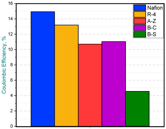 Regarding Coulombic efficiency, the MFC equipped with the Nafion membrane achieved the highest average value at 14.92%, closely followed by the R-4 ceramic membrane, which reached a comparable efficiency of 13.18%. On the other hand, the B-S membrane MFC exhibited the lowest CE (4.54%), likely due to its reduced power output (Figure 8).