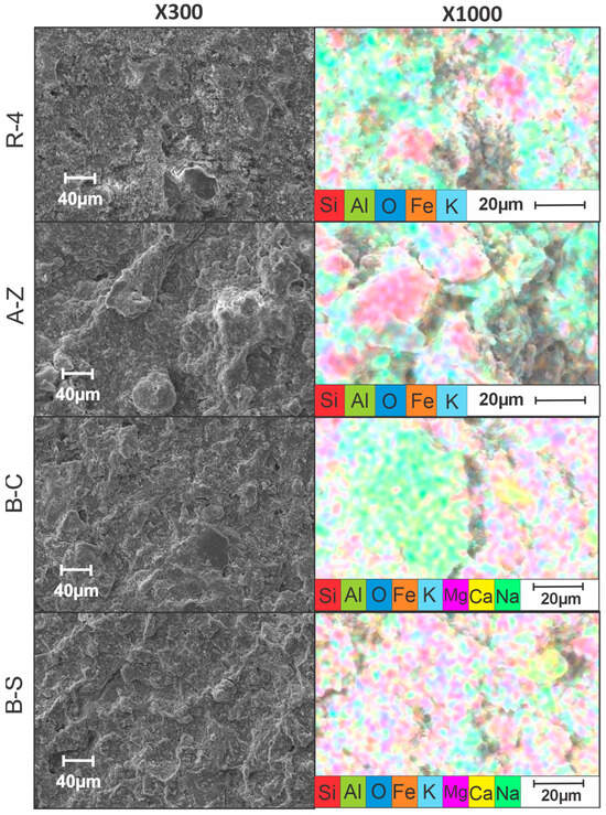 SEM micrographs obtained at 300 and 1000 magnification levels, reveal distinct morphological differences among the ceramic membranes. In this way, the A-Z and R-4 samples exhibit relatively compact and homogeneous surface textures, with uniform grain distribution, suggesting effective sintering and structural stability. In contrast, the B-C and B-S membranes display more heterogeneous and porous surfaces, which may indicate inconsistencies during the fabrication or sintering processes (Figure 9).