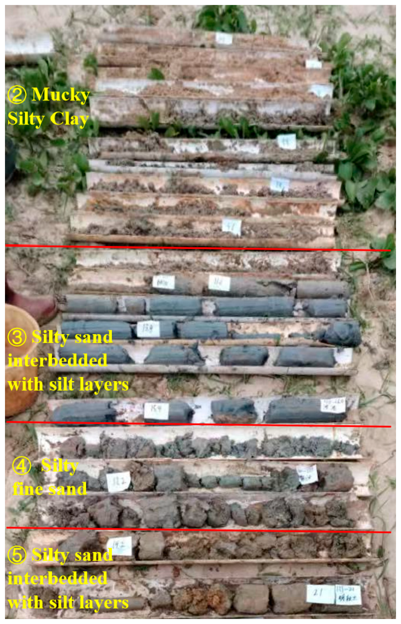 - Silty fine sand: This is a grey, clear-layered, medium-density, and saturated silty fine sand with an average thickness of about 5.40 m. The soil layer has medium compressibility, medium strength, and better engineering properties.