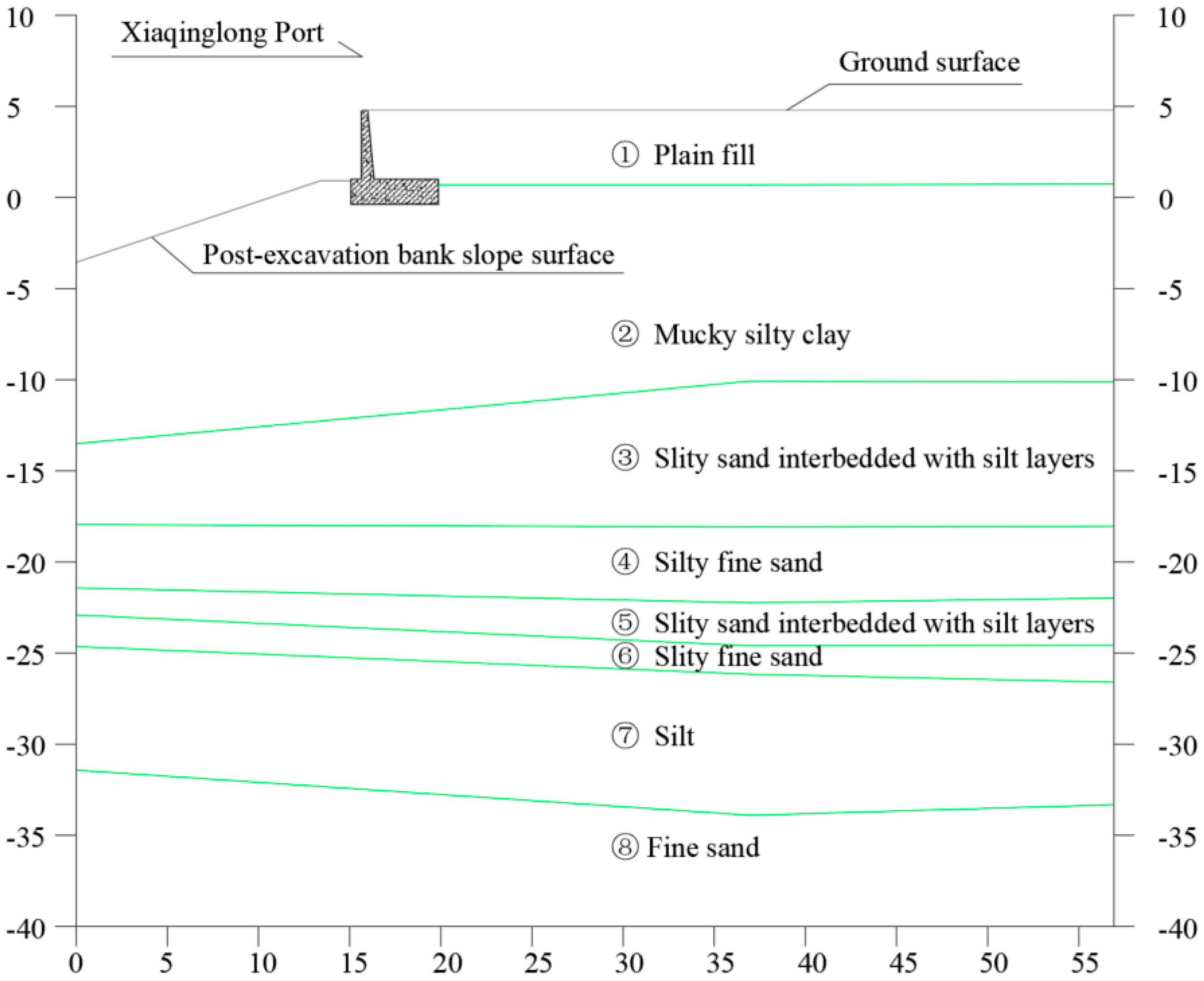 - Silty fine sand: This is a grey, medium-density, and saturated silty fine sand with an average thickness of about 7.39 m. The soil layer has good particle size gradation, medium compressibility, medium strength, and better engineering properties.