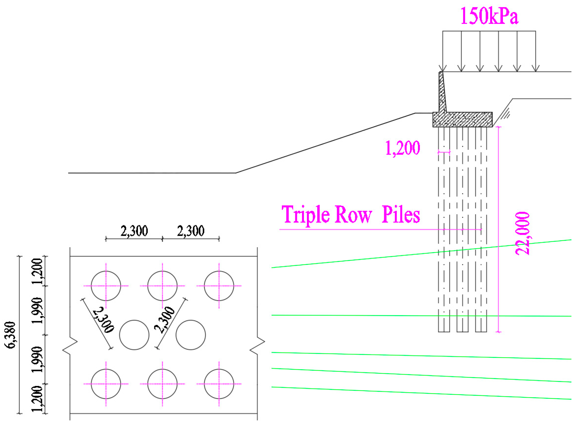 - The excavated slope can only maintain its own stability and will undergo deformation under heaped loads. Additionally, it is necessary to take the soil mass and the pile layout scheme into consideration due to the possibility of the soil mass sliding around and between the piles.