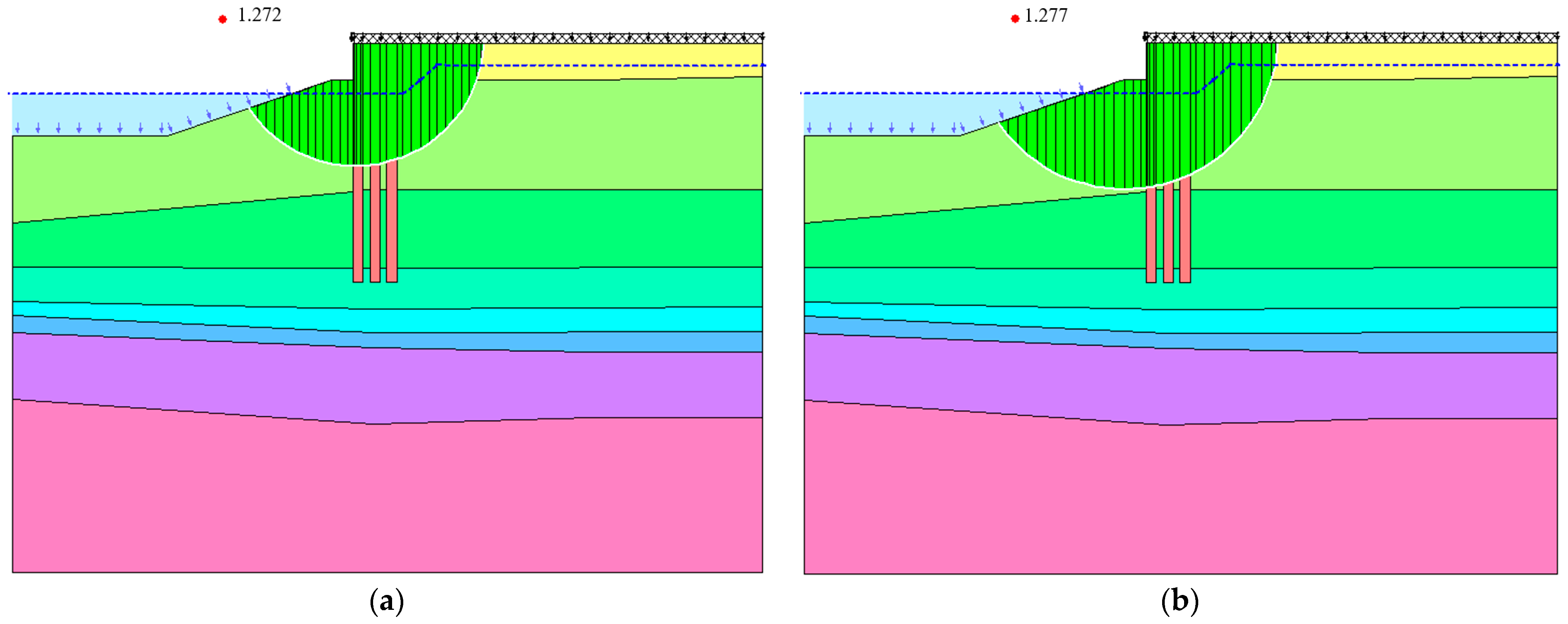 4.1. Potential Failure Mode of Natural Bank Slope Under Heaped Loads and Pile Foundation Scheme