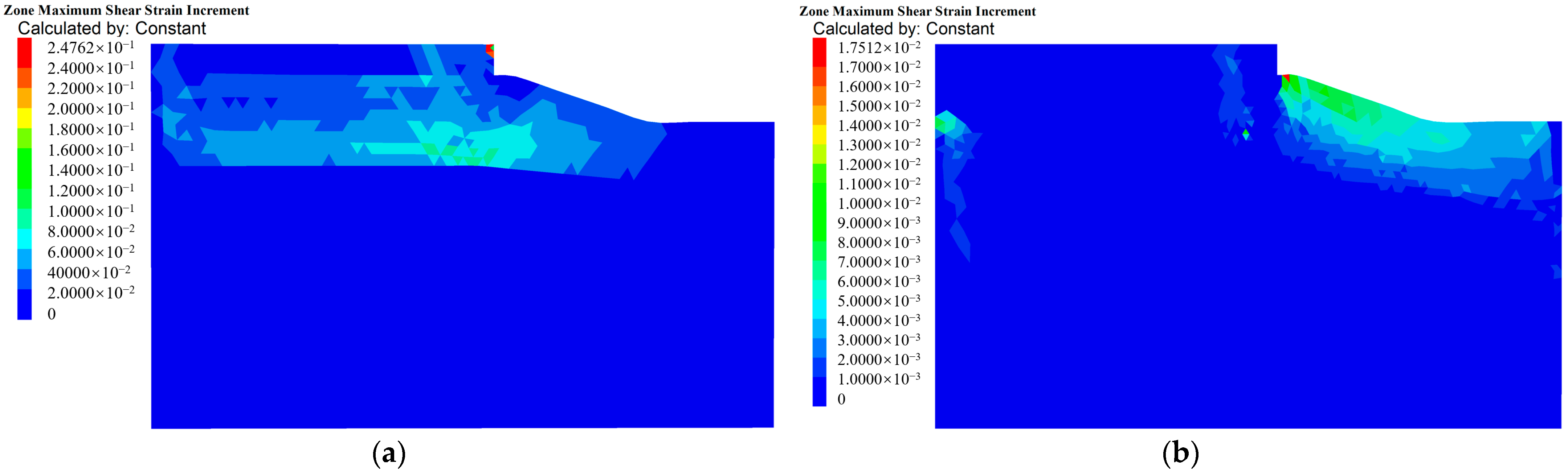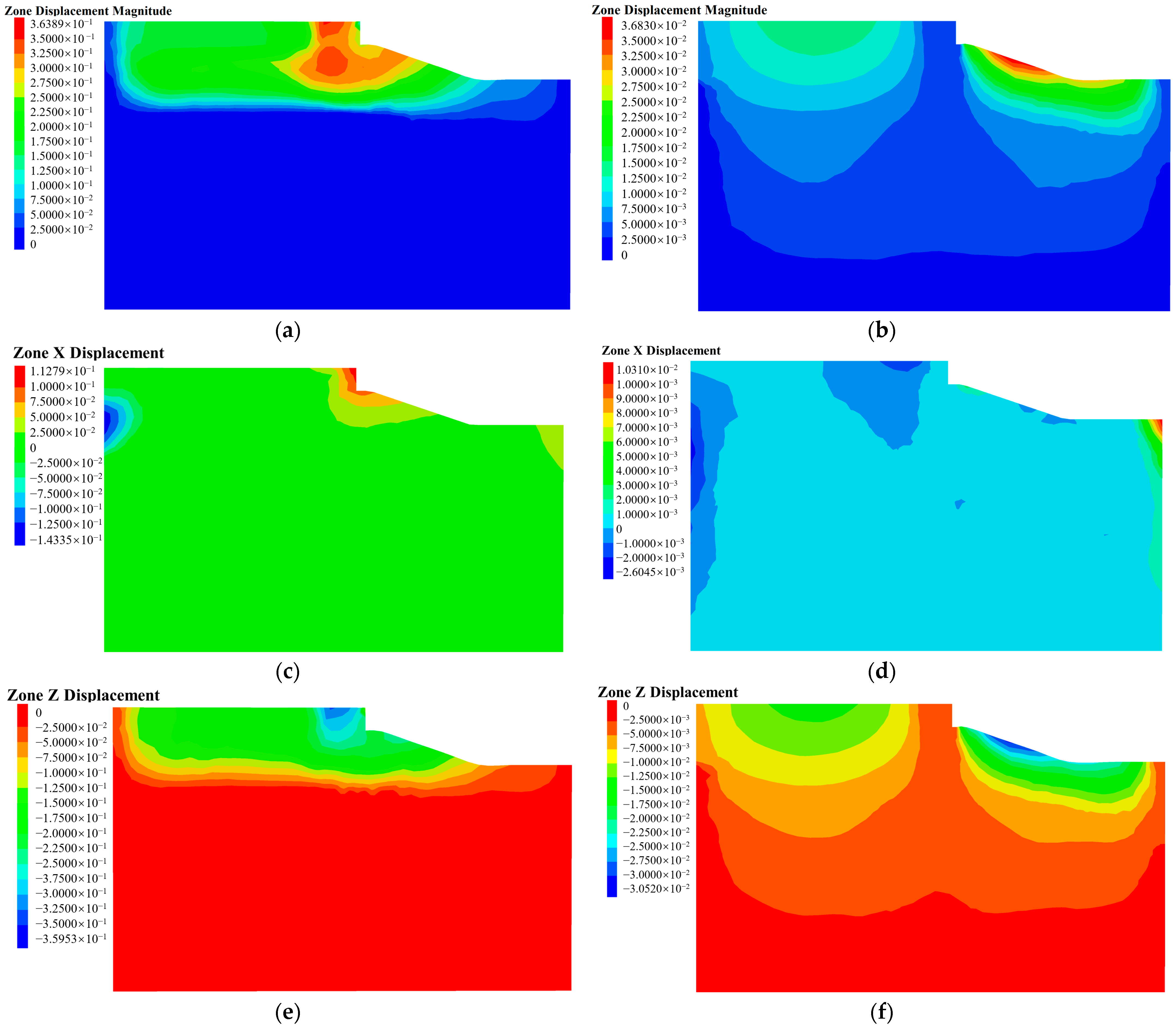 - Based on the displacement cloud map in Figure 15a, it can be found that the main displacement area is essentially consistent with the potential sliding surface obtained by the 2D calculations. The failure surface occurs in both the mucky silty clay and plain fill layers, consistent with the potential failure mechanism analysis.
