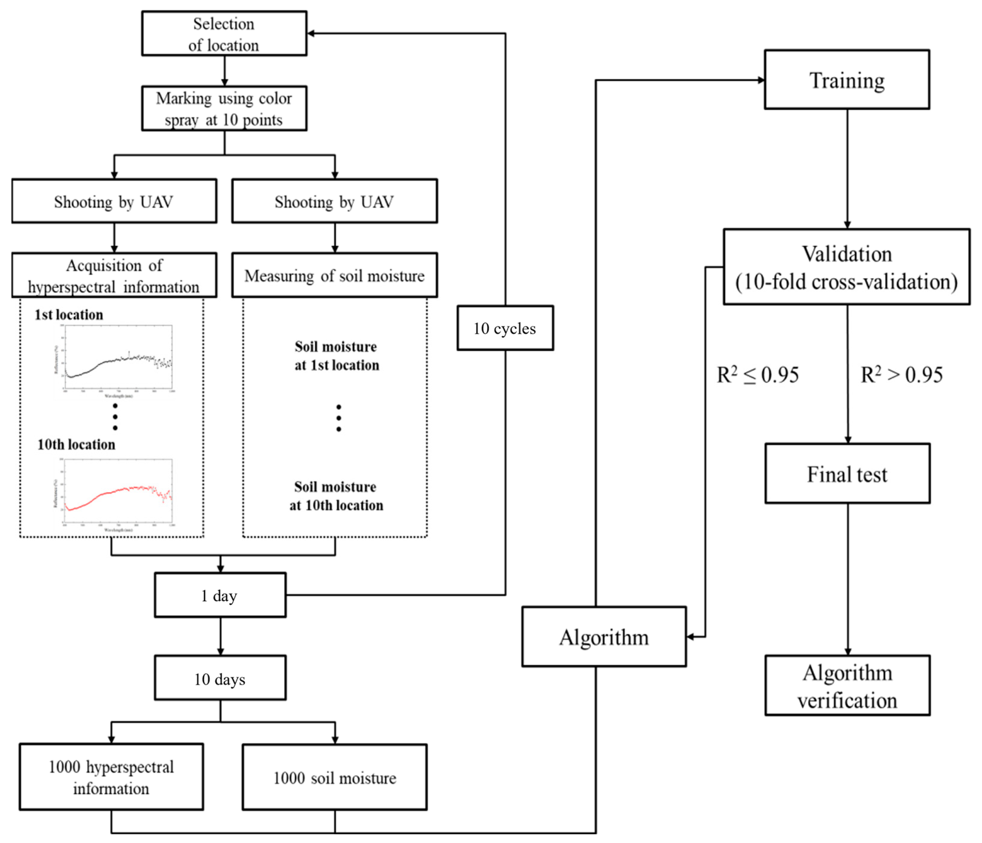 This study addresses limitations of prior approaches by excluding laboratory scanning and using hyperspectral reflectance acquired in the field by an unmanned aerial vehicle directly as training data. This design preserves field-dependent factors such as illumination, viewing geometry, surface roughness, and temporal moisture variability to mitigate the reduced transferability often observed with laboratory spectra. In addition, we avoid generating secondary indices through scaling or feature extraction and instead feed wavelength-resolved raw reflectance to retain spectral structure without loss. Finally, we avoid mixing external large datasets and construct our own corpus of 1000 paired observations (spectrum information and soil moisture) collected with the same sensor and protocol, thereby reducing both domain shift and the risk of optimistic bias associated with small test samples.