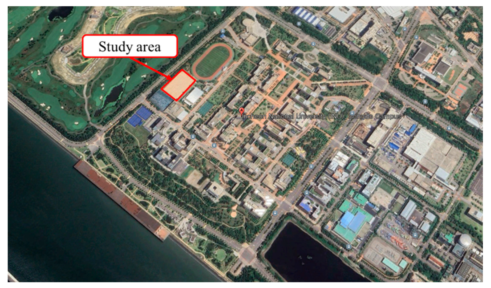 The study area is located in Songdo, Incheon, Republic of Korea (WGS 84: 37.375294° N, 126.633010° E). The climate is marked by humid summers and cold winters. The specific site is a vegetation-free dirt athletic field on the Incheon National University campus, rectangular in shape (100 m × 60 m), with sandy soil. Although the use of a single site is a limitation, this location was selected because (i) soil moisture can be measured immediately at the same points after hyperspectral acquisition, minimizing label error and delay-related bias; (ii) the absence of vegetation, shadows, and strong surface heterogeneity reduces interference and prioritizes internal validity of the spectral moisture relation; (iii) the flat rectangular layout facilitates repeat flights, consistent viewing geometry, and application of panel based radiometric calibration; and (iv) on-campus access and flight permissions enable repeated observations over ten days, including a post-rain session.