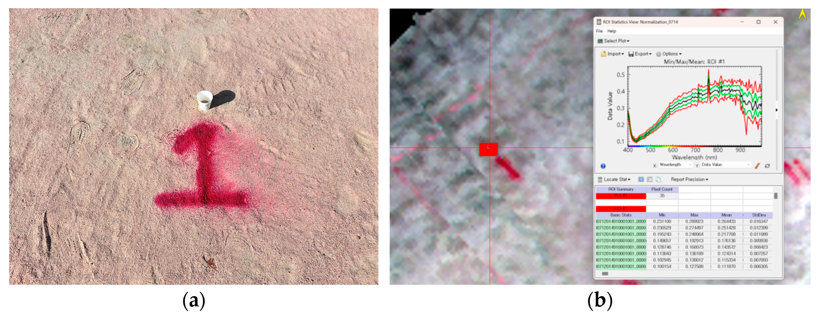 Ground points without vegetation were marked with color spray to match the soil sampling locations. Flight polygons were planned to cover the marked area in one sortie under stable daylight. For each numbered point, a region of interest (ROI) was drawn on the hyperspectral information, and the mean reflectance within the ROI was used as the spectral descriptor. Example frames and ROIs are shown in
