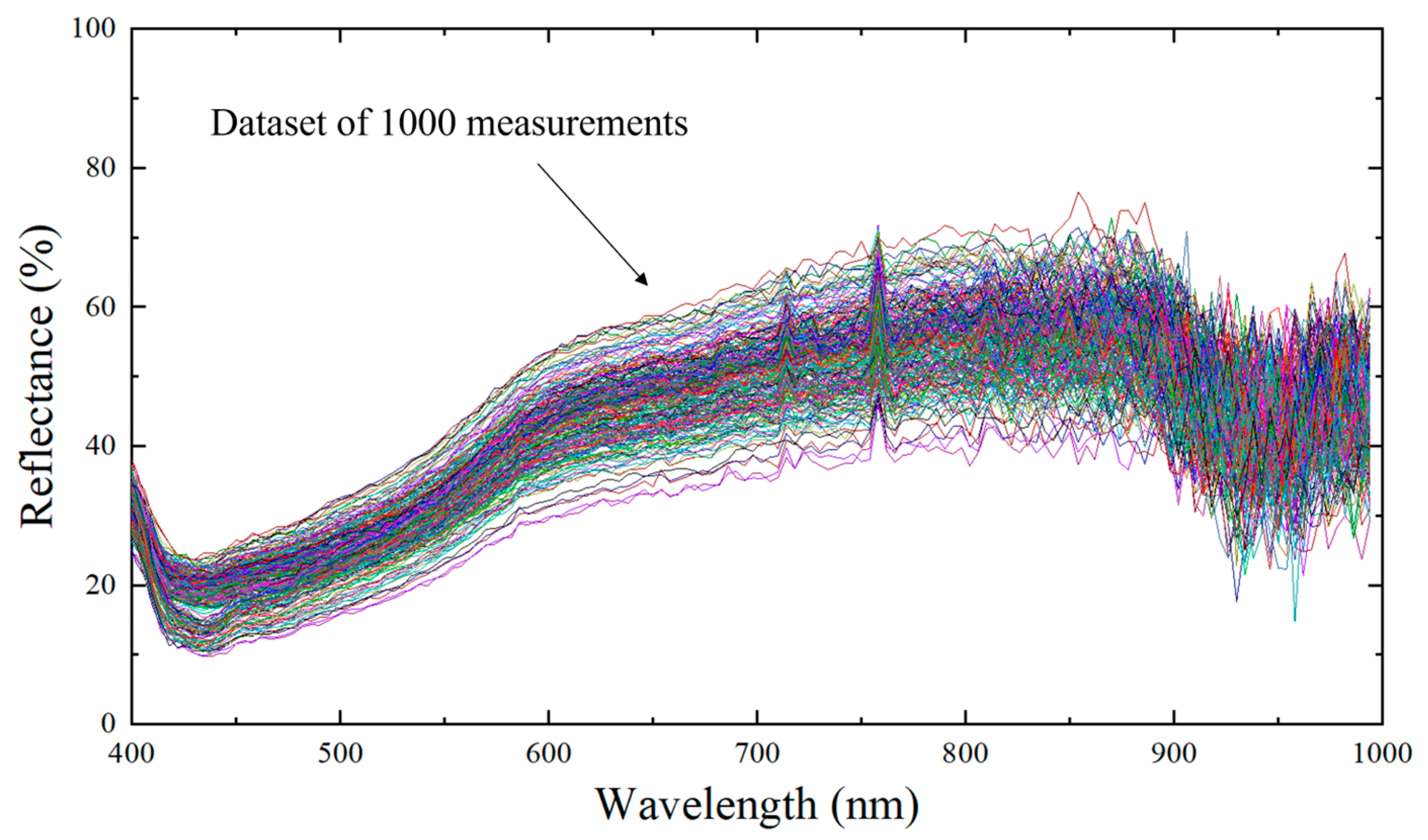 After calibration, spectra were resampled at 4 nm to balance information content and processing time, yielding 147 bands from 398 to 982 nm. The ensemble of calibrated spectra is shown in