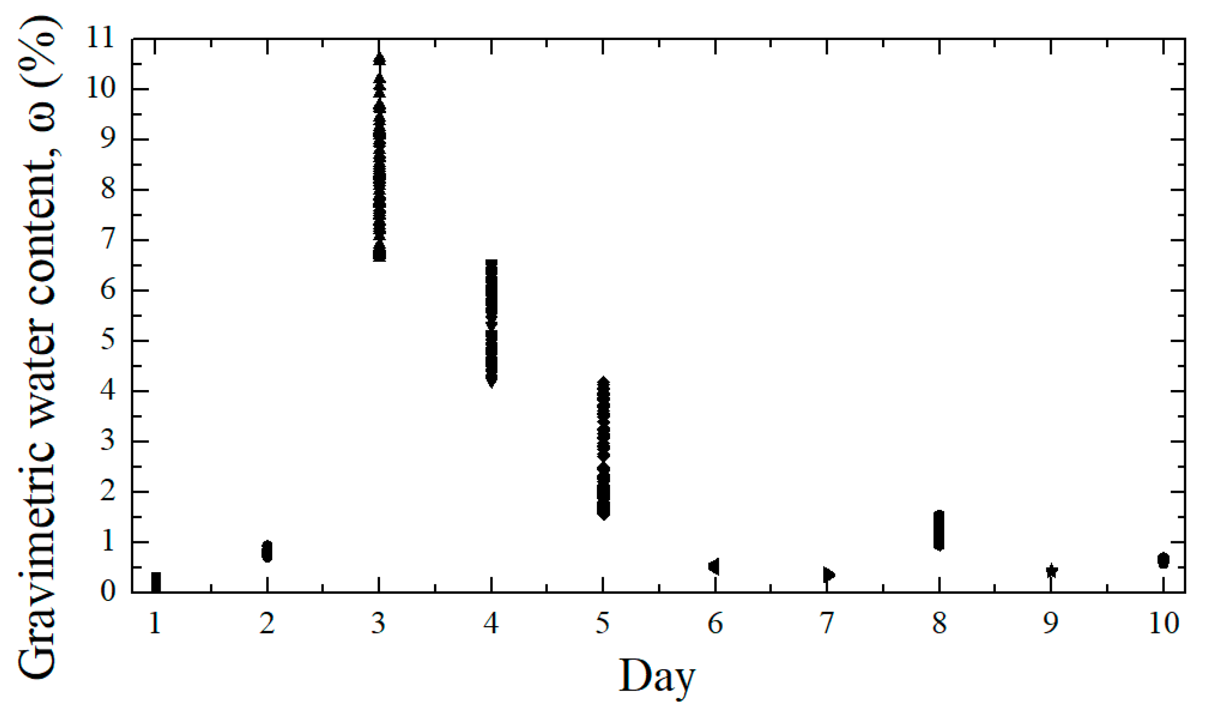 Figure 6. Measurements were not carried out on consecutive calendar days. Rainfall occurred between Day 2 and Day 3; the Day 3 measurement was executed after precipitation ceased. GWC increased and showed a wider spread on the post-rain day, whereas other days during summer exhibited generally low values and a low coefficient of variation.