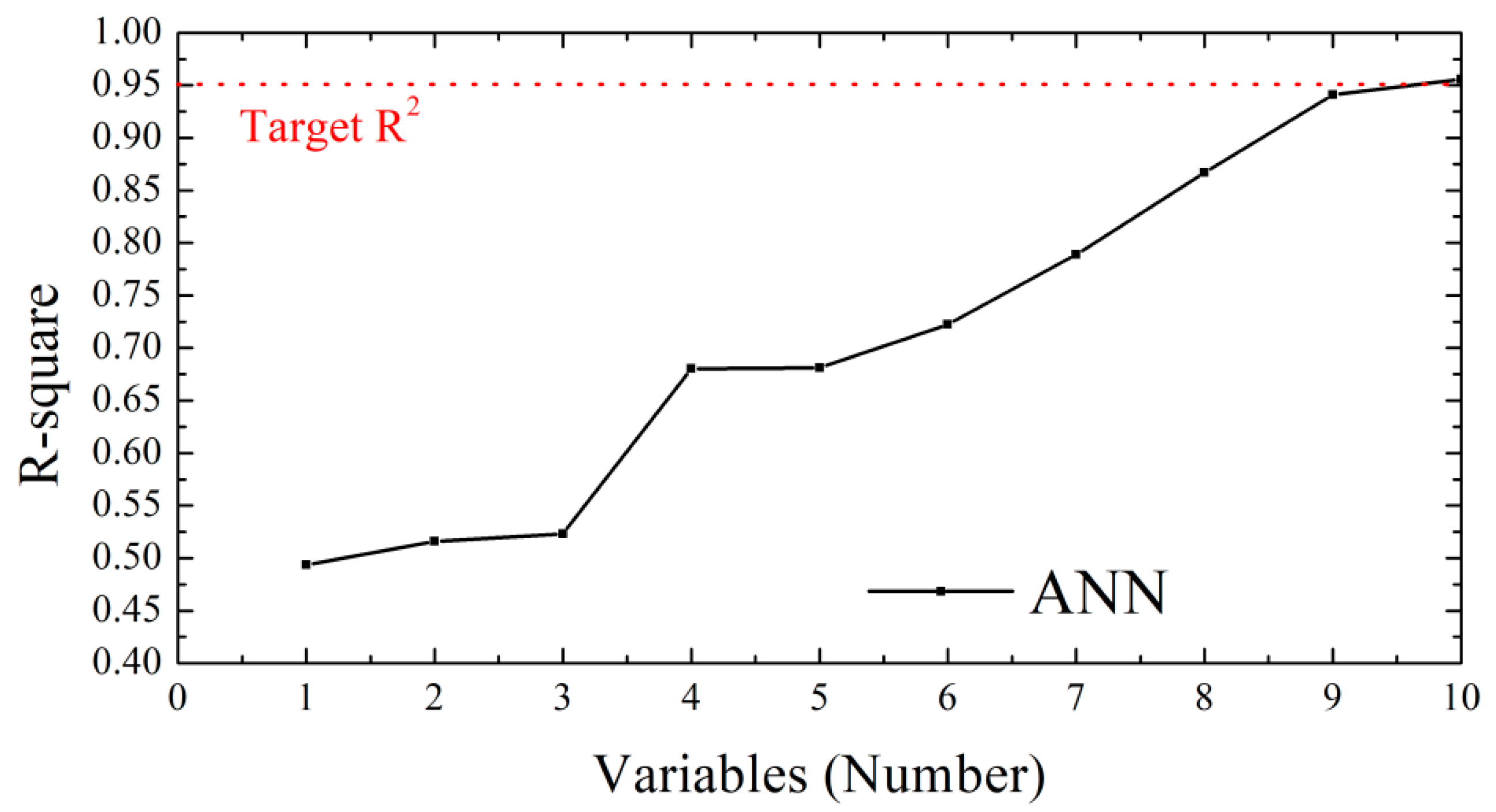 Figure 11. With one to three variables, the cross-validated coefficient of determination was about 0.50 to 0.60, indicating that a very small set of bands could not represent the nonlinear structure of the spectra. With four features, the value rose to about 0.70, suggesting that the inclusion of the most informative wavelengths began to recover the dominant moisture related patterns. From five to eight variables, accuracy improved steadily to about 0.85 to 0.90, reflecting the growing ability of the model to combine complementary bands and the engineered transforms. With ten variables, the network reached an R