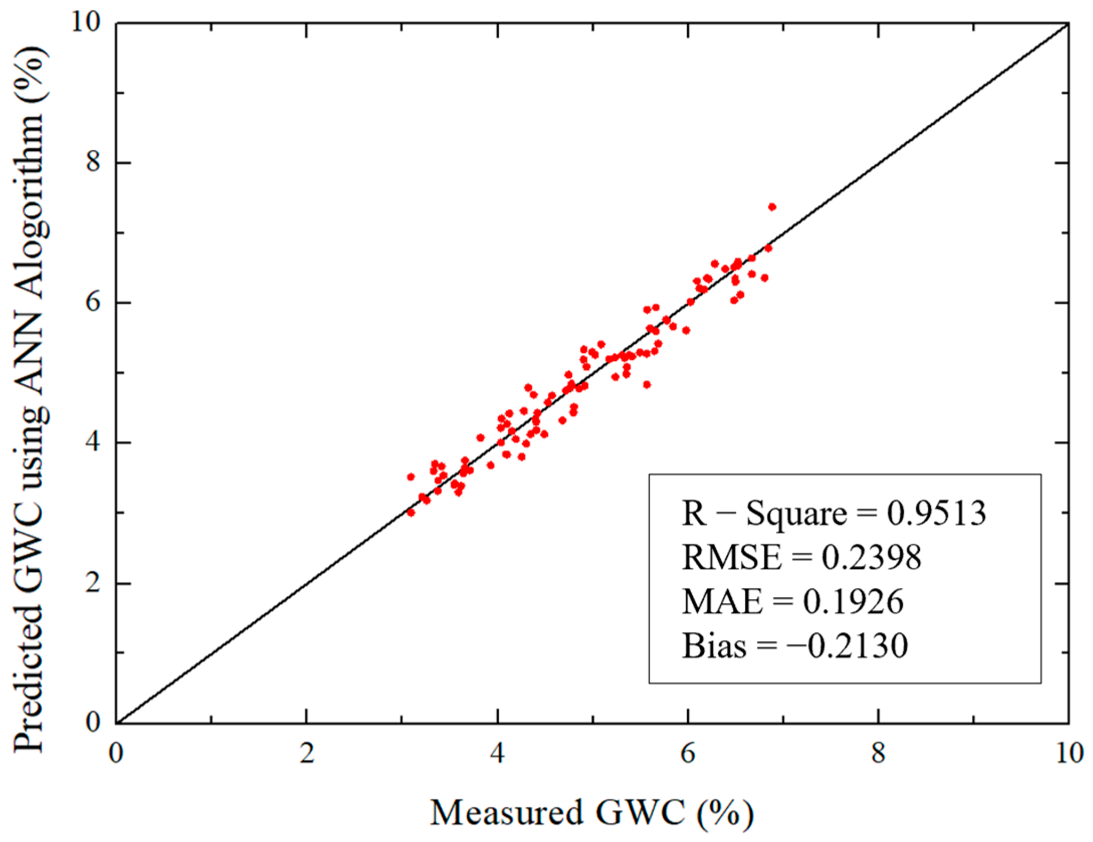 2 = 0.9513, indicating that most of the variance in the measurements is explained by the model. The errors were compact, with RMSE = 0.2398 and MAE = 0.1926, which show small average deviations and only a modest portion of larger errors. The mean bias error was −0.2130, indicating a systematic tendency to underestimate. In practice, an offset correction equal to the bias would remove this shift, after which RMSE and MAE would represent primarily random dispersion. Finally, the result indicates that the ANN maintained high explanatory power on unseen data and effectively met the research’s target performance. This supports field applicability and temporal stability within the same site and acquisition protocol.